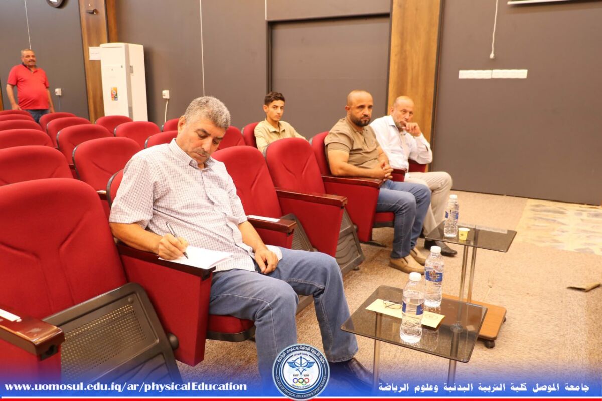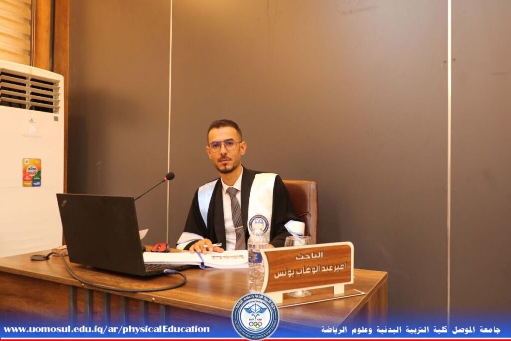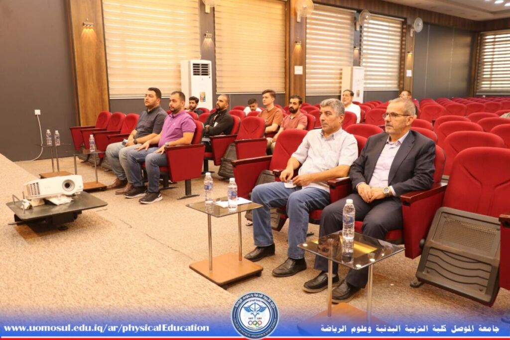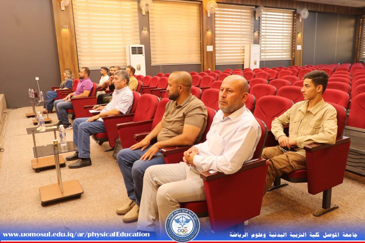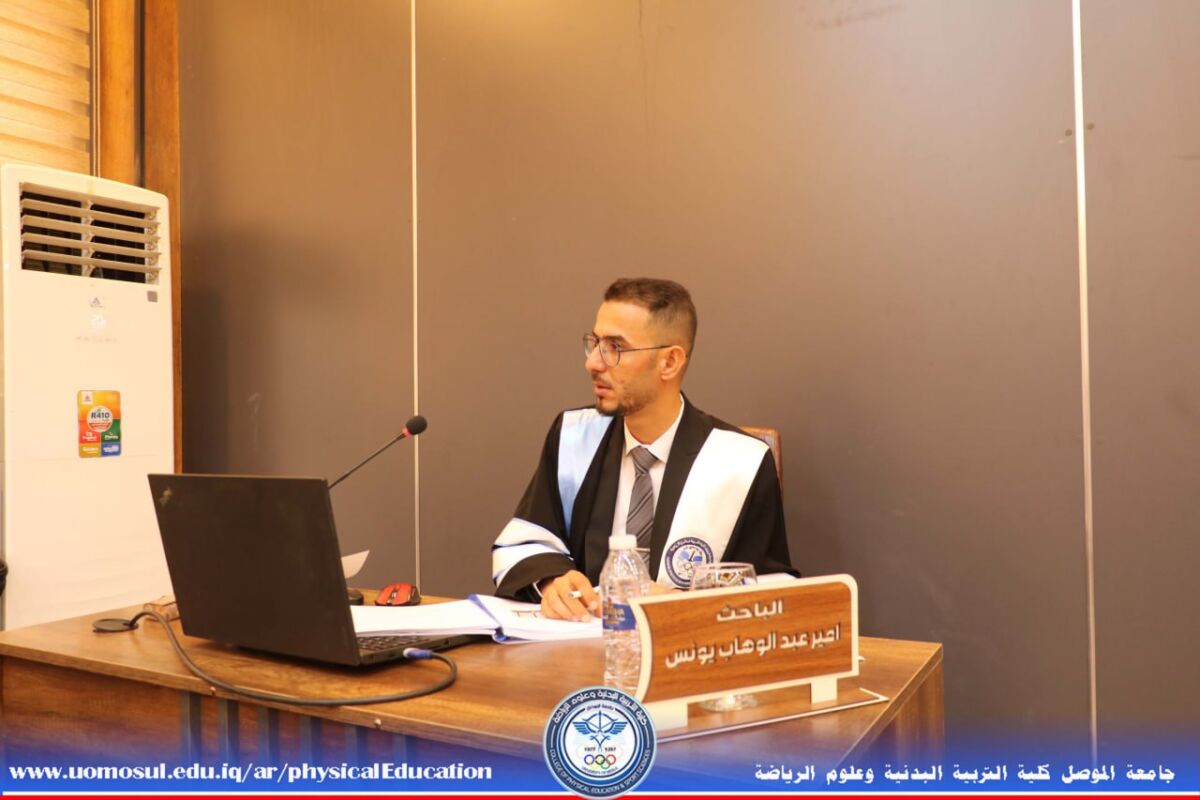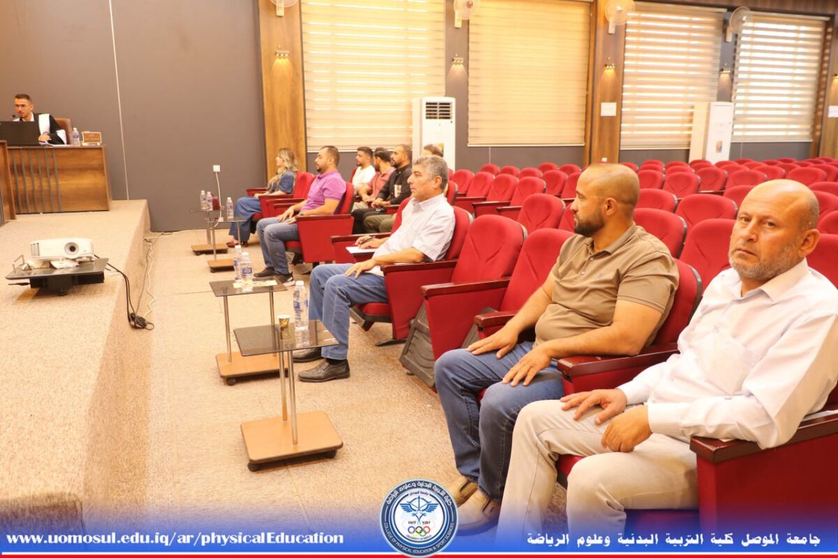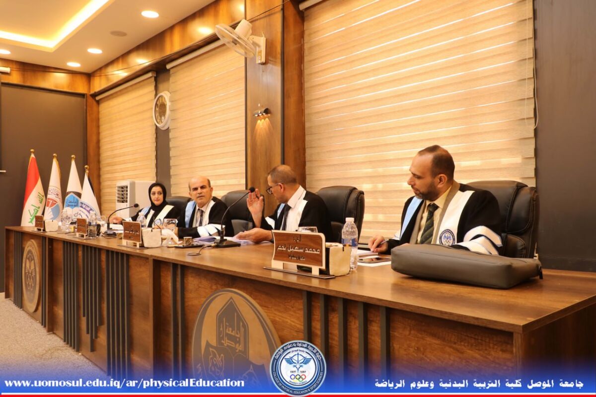 The College of Physical Education and Sports Sciences discussed a master’s thesis on the educational design of basketball skills based on the CrossFit system and its impact on developing some physical and motor characteristics and skill achievement for fifth-grade middle school students on Wednesday, August 20, 2025. Professor Dr. Nat Bashir Ibrahim, Assistant Dean for Administrative and Financial Affairs, and a number of college instructors attended part of the discussion. The thesis submitted by researcher Amir Abdul Wahab Al-Khutabi addressed the educational design of basketball skills based on the CrossFit system and its impact on developing some physical and motor qualities and skill achievement for fifth-grade middle school students.