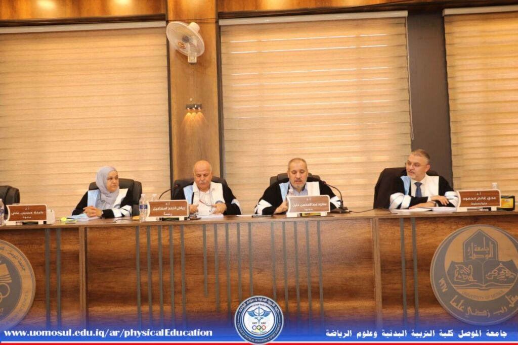 The College of Physical Education and Sports Sciences held a master’s thesis discussion on Thursday, August 21, 2025, on the relationship between heads of sports talent care departments and their employees and its role in reducing job burnout in Iraq.