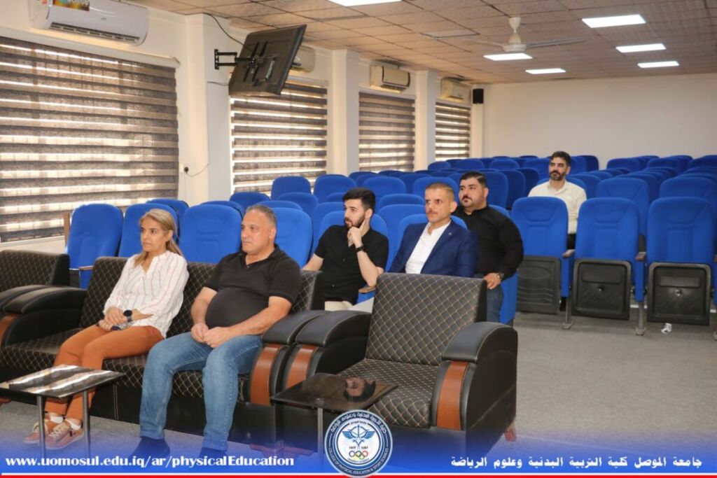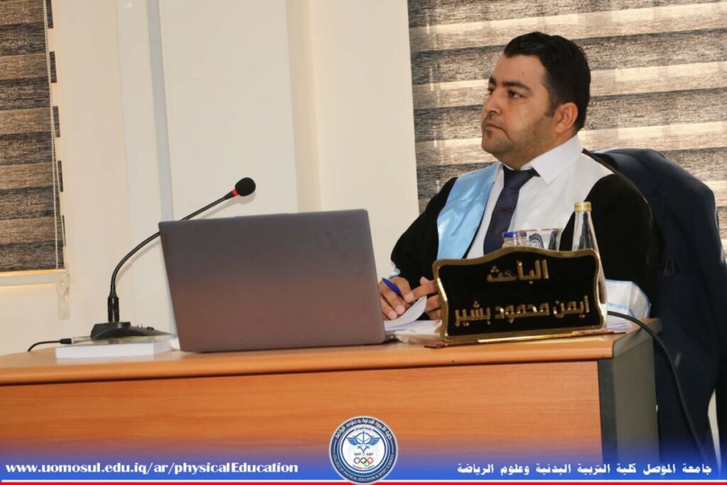 The College of Physical Education and Sports Sciences hosted a master’s thesis discussion on Thursday, August 28, 2025, entitled “The Effect of Visual and Tactical Scanning Exercises on a Number of Visual Abilities, Physical, and Skill Variables of Deaf Football Players with Disabilities.” Part of the discussion was attended by Dr. Zini Mishko Haji and a number of faculty members. The thesis, presented by student Ayman Mahmoud Bashir, addressed the topic of “The Effect of Visual and Tactical Scanning Exercises on a Number of Visual Abilities, Physical, and Skill Variables of Deaf Football Players with Disabilities.” The study aimed to reveal the significance of statistical differences in a number of visual abilities, physical, and skill variables between the pre- and post-tests of the experimental group players. The researcher used the experimental method, and the research sample consisted of players from the Nineveh Paralympic Committee. The discussion committee was chaired by Professor Dr. Abdul-Jabbar Abdul-Razzaq Hasso, with Assistant Professor Dr. Idham Saleh Mahmoud and Assistant Professor Ahmed Sabah Qasim as members, and was supervised and included Professor Dr. Mahmood Hamdoon Younis.