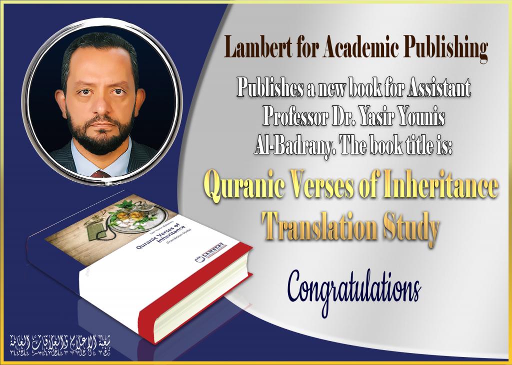 Lambert for Academic Publishing / Germany publishes a new book for Assistant Professor Dr. Yasir Younis Al-Badrany. The book title is: Quranic Verses of Inheritance (Translation Study). It discusses some of the problems of translating verses of inheritance in the Noble Quran into English.