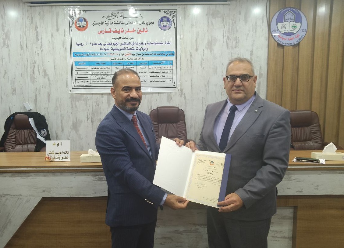 The letter of appreciation was issued on Monday, 17 March 2025, in recognition of Dr. Mneikher’s membership in the committee for the defense of the master’s thesis of the student Nalin Khidir Naif. The Dean of the College, Assistant Professor Dr. Tareq Mohammed Tayeb, presented the letter of appreciation, expressing his gratitude for Dr. Mneikher’s efforts and for enduring the hardship of travel from Baghdad to Mosul.