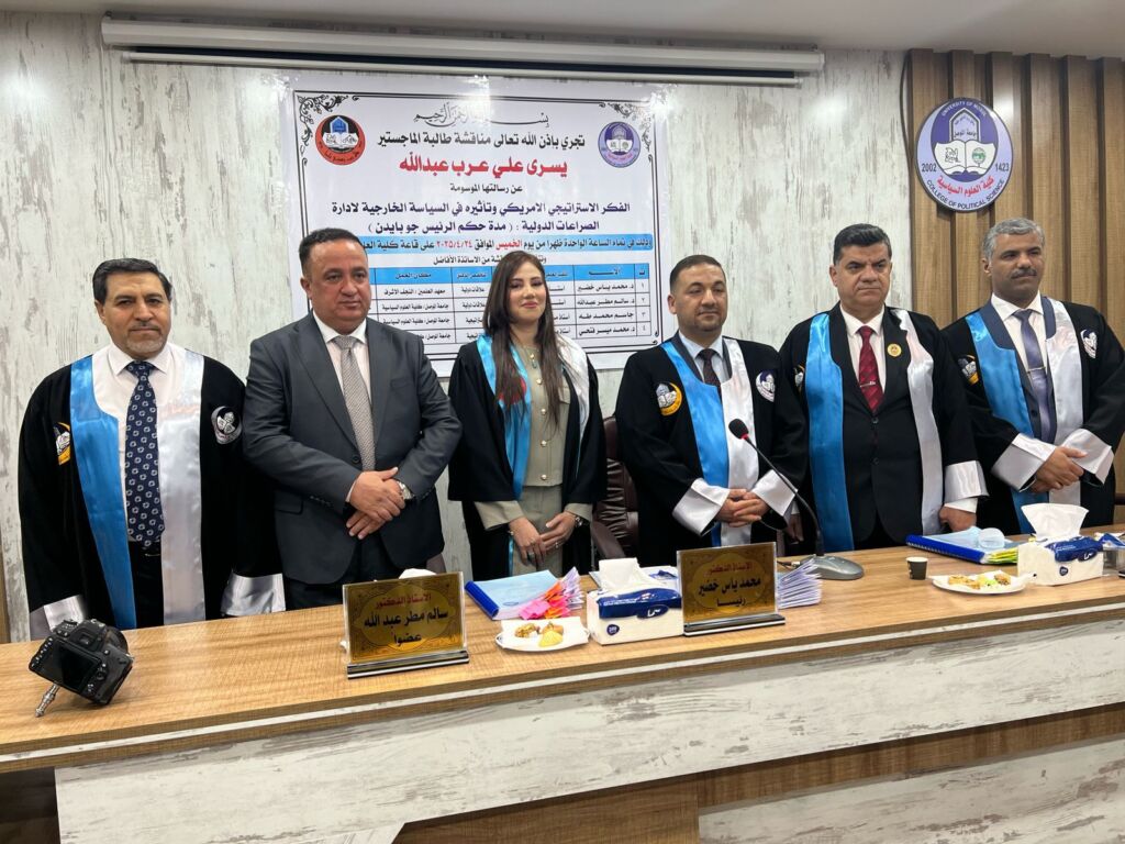 A master’s thesis titled “American Strategic Thought and Its Impact on Foreign Policy in Managing International Conflicts: The Period of President Joe Biden” was discussed at the College of Political Science, University of Mosul, on Thursday, 24 April 2025. The thesis was submitted by the student Yusra Ali Arab.