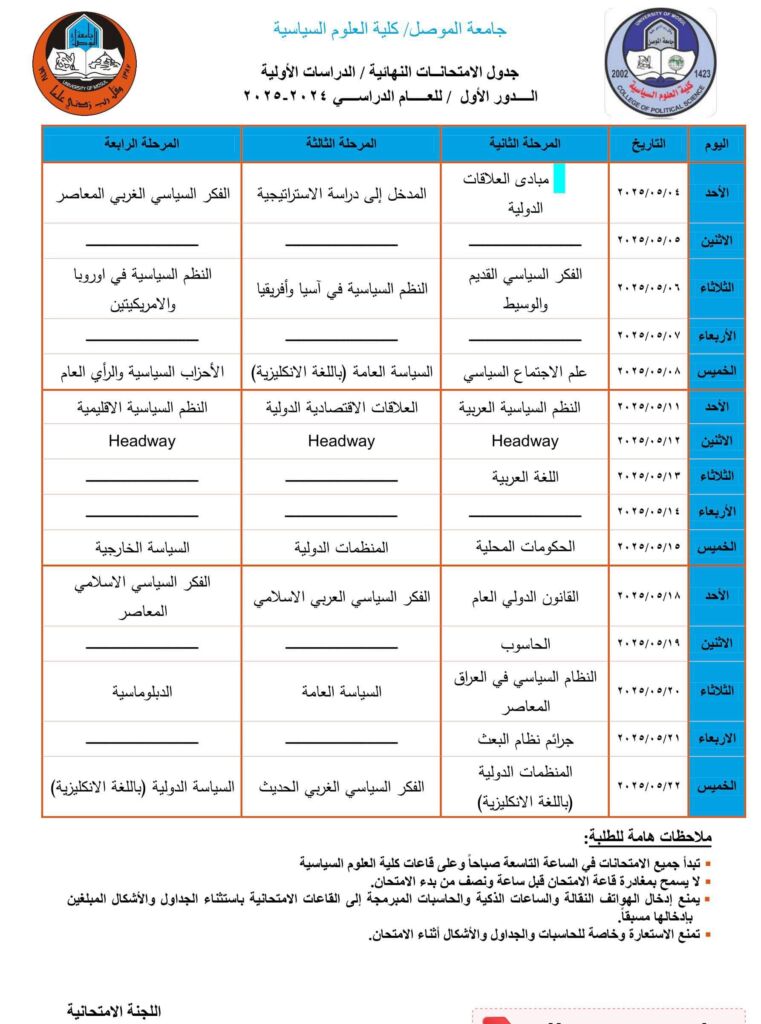 The College of Political Science at the University of Mosul has completed all preparations for the final examinations of the 2024–2025 academic year
