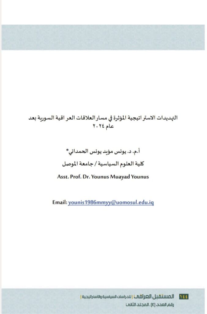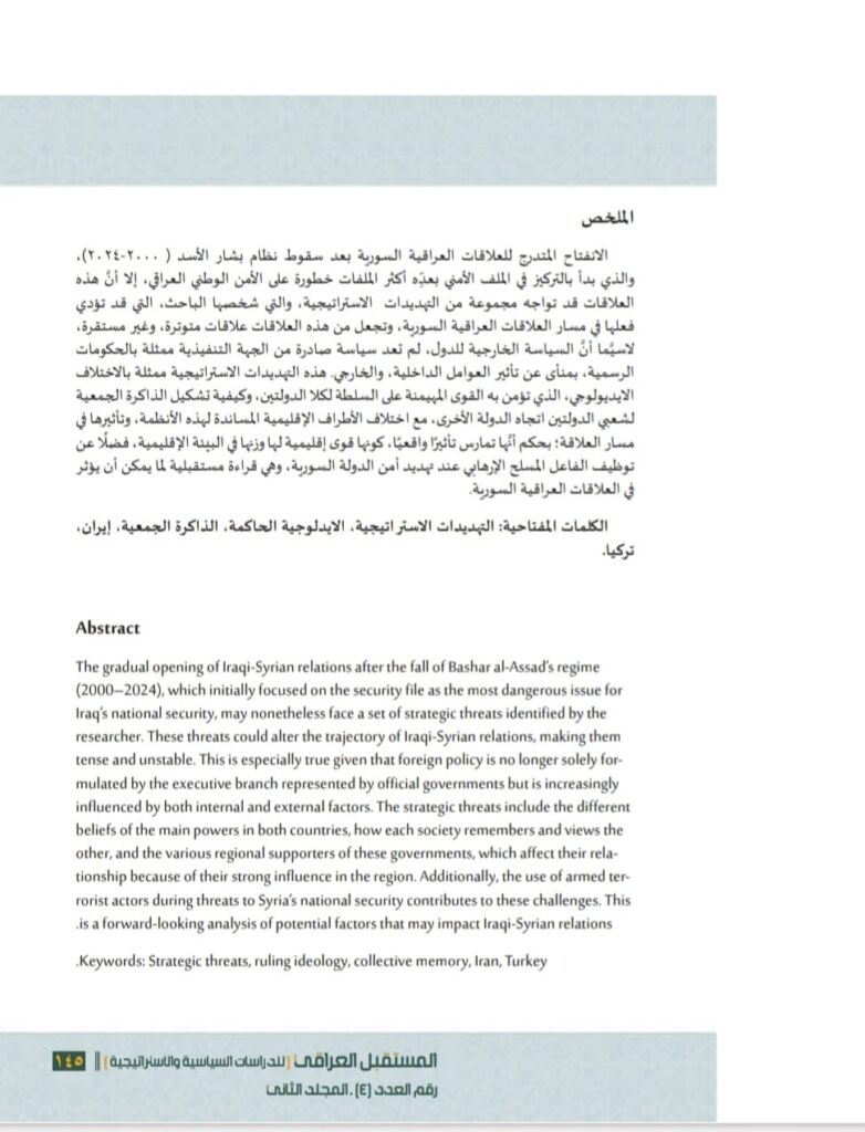 “Strategic Threats Affecting the Course of Iraqi-Syrian Relations After 2024,” and was published in June 2025.