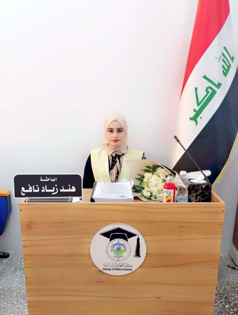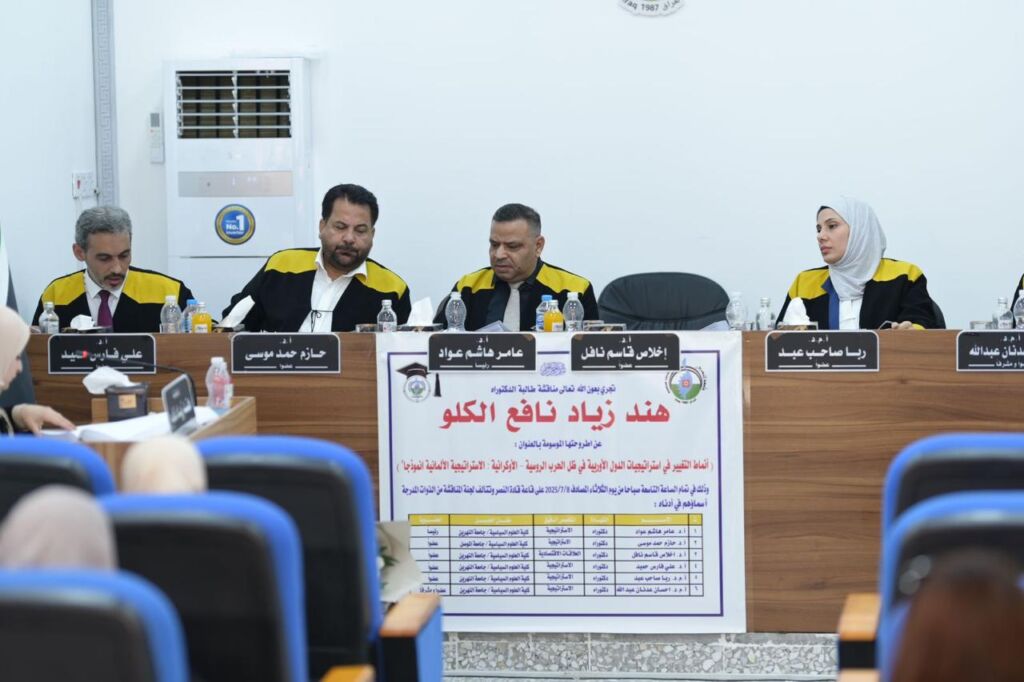 A Ph.D. dissertation defense was held at the College of Political Science – Al-Nahrain University for Assistant Lecturer Hind Ziyad Nafi’, a faculty member in the Department of International Relations at the College of Political Science – University of Mosul. The dissertation was entitled: “Patterns of Change in European States’ Strategies in Light of the Russian-Ukrainian War: The German Strategy as a Case Study.” The defense took place on Tuesday, 8 July 2025.