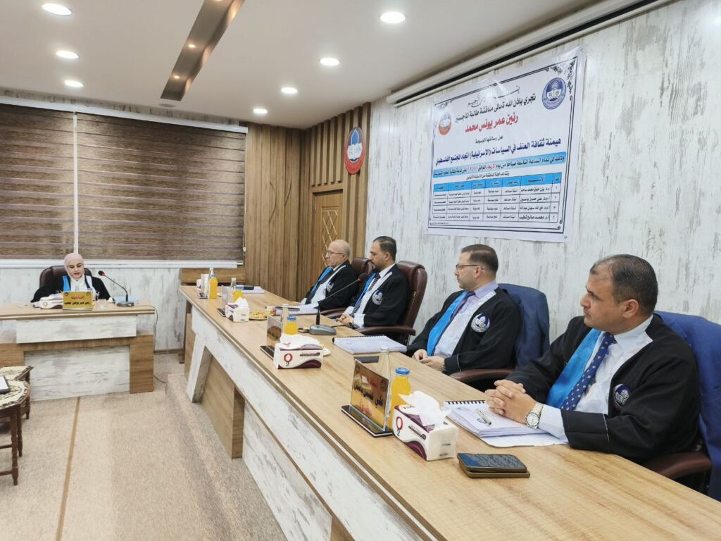The examination committee was composed of Asst. Prof. Dr. Yazan Khalloq Mohammed Sajid (Chair), Asst. Prof. Dr. Ali Hussein Yaseen (Member), Asst. Prof. Dr. Khairallah Subhan Al-Jubouri (Member), and Asst. Prof. Mohammed Saleh Shateeb (Member and Supervisor). The discussion was attended in part by the Dean of the College, Asst. Prof. Dr. Suhaib Khalid Jassim Al-Taie, the Head of the Public Policy Department, Prof. Dr. Waleed Salem Mohammed, as well as the heads of the Graduate Studies and Media Divisions, in addition to a group of postgraduate students. Following the discussion, the committee’s decision was read, which included the acceptance of the thesis with necessary modifications.