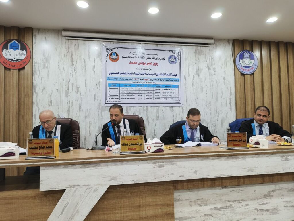 A master’s thesis titled “The Dominance of the Culture of Violence in Israeli Policies Toward the Palestinian Society” was discussed at the College of Political Science, University of Mosul, on Wednesday, 9 July 2025. The thesis was submitted by the student Raneen Omar Younis.