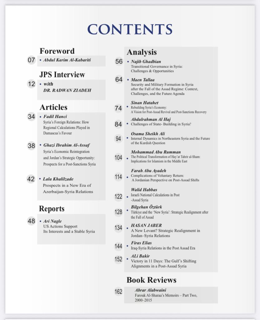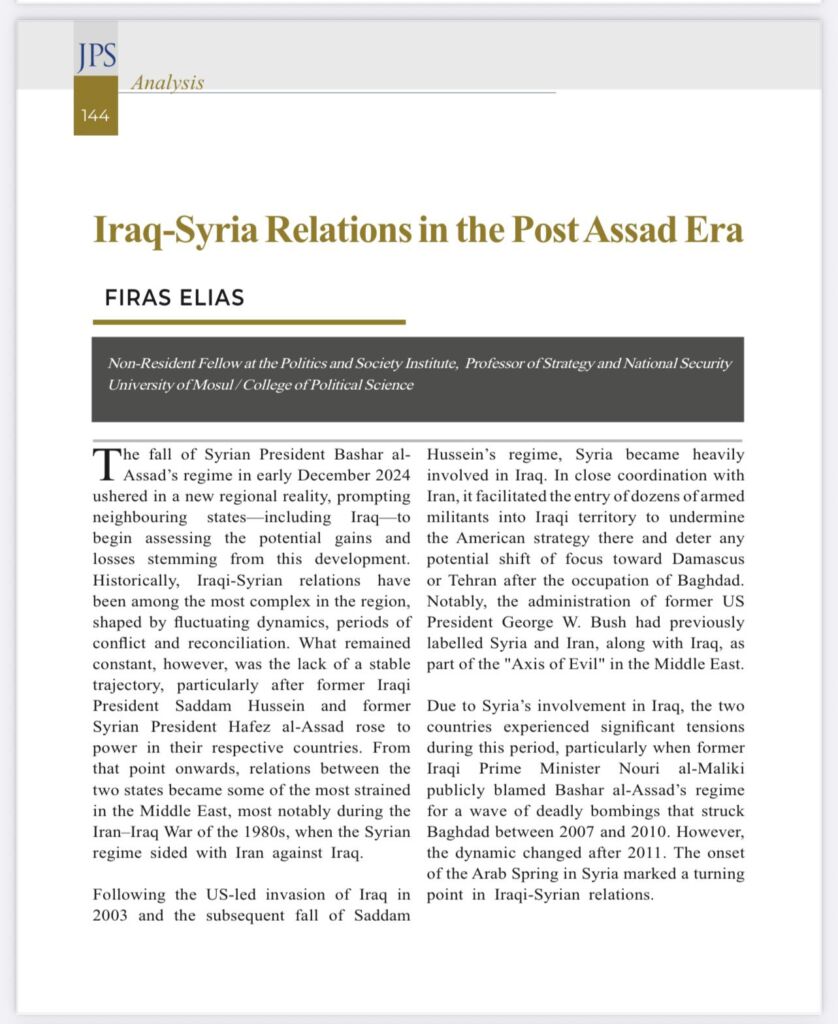 The study, written in English, focuses on Iraqi-Syrian relations in the post-Assad era and appeared in the journal’s June 2025 issue, titled “Syria: A New Era.”