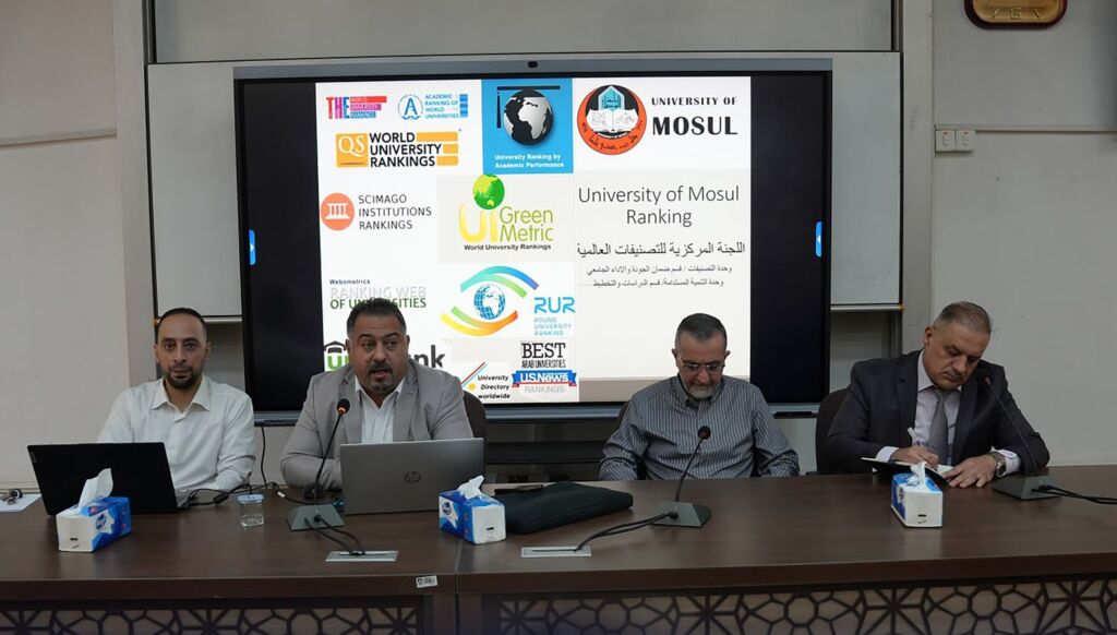 The Department of Studies and Planning at the University of Mosul, in cooperation with the Quality Assurance Department, held a workshop on how to fill out the forms related to the Green Metric ranking for green universities, as the University of Mosul is considered one of the sustainable universities. The workshop was attended by college vice-deans, heads of relevant divisions, and sustainable development focal points, on Thursday, 17 July 2025.