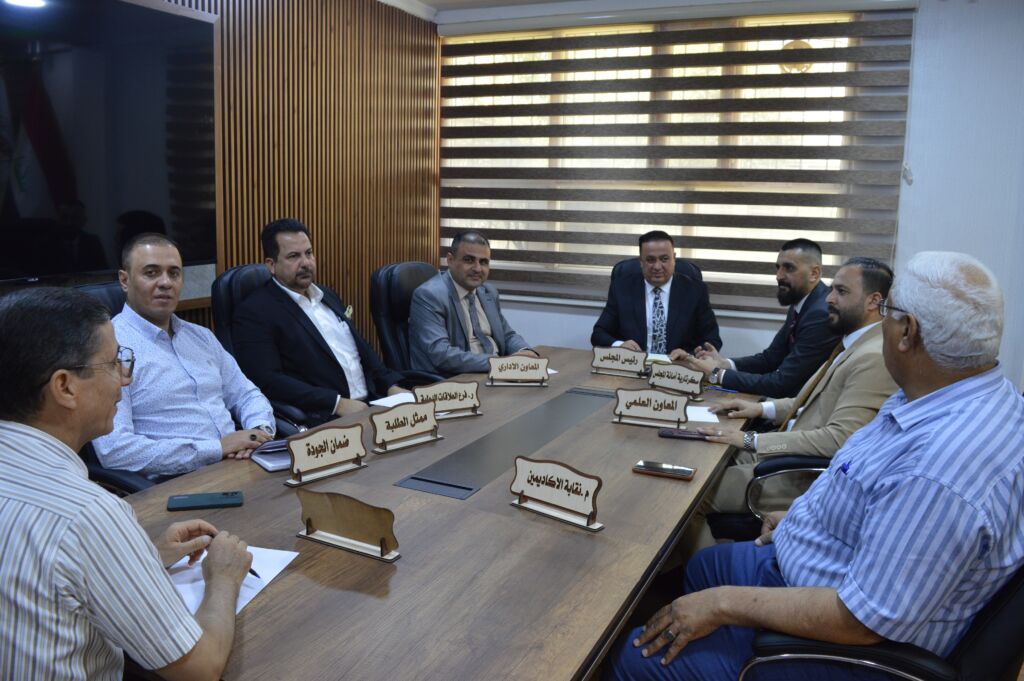 The meeting was chaired by the Dean of the College, Asst. Prof. Dr. Suhaib Khalid Jasim Al-Taie, in the presence of the Scientific and Administrative Assistants, Asst. Prof. Dr. Khairallah Sabhan Al-Jubouri and Asst. Prof. Dr. Ali Hussein Yassin. Also present were the Heads of the Departments of International Relations and Public Policy, Prof. Dr. Hazim Hamad Musa and Prof. Dr. Waleed Salem Mohammed, the representative of the Iraqi Academics Syndicate/Nineveh Branch, Prof. Dr. Adnan Khalaf Al-Badrani, as well as the Council’s Rapporteur, Asst. Prof. Dr. Younis Muaid Al-Dabbagh.