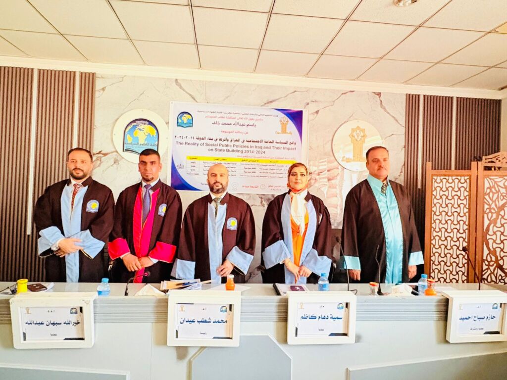 In line with the Sustainable Development Goals—Goal 1: No Poverty, Goal 10: Reduced Inequalities, and Goal 16: Peace, Justice and Strong Institutions—a master’s thesis by student Basim Abdullah Mohammed Khalil, entitled “The Reality of Social Public Policy in Iraq and Its Impact on State-Building 2014–2024,” was defended at the College of Political Science, University of Tikrit, on Thursday, 4 September 2025.