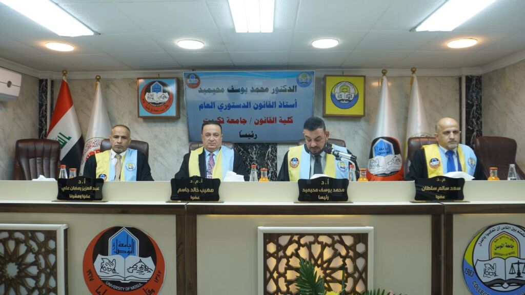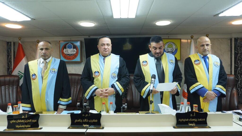 The defense committee was composed of Professor Dr. Mohammed Yousif Muhaymid (Chair), Assistant Professor Dr. Sohaib Khalid Jasim, Dean of the College of Political Science at the University of Mosul (Member), Lecturer Dr. Saad Salem Sultan (Member), and Professor Dr. Abdulaziz Ramadan Al-Khattabi (Member and Supervisor).