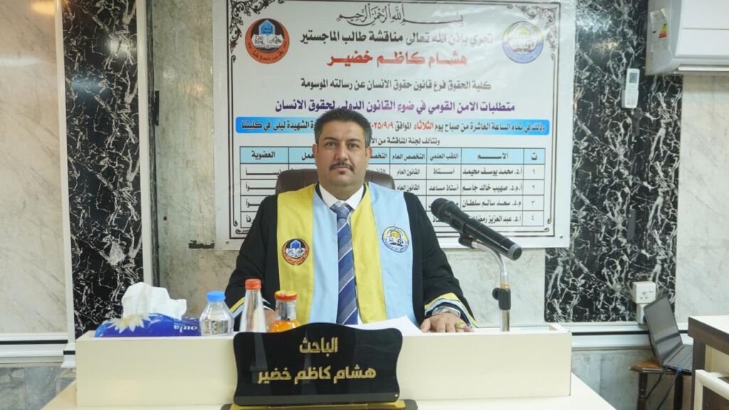 In implementation of the Sustainable Development Goals—Goal 10: Reduced Inequalities, Goal 16: Peace, Justice and Strong Institutions, and Goal 17: Partnerships for the Goals—a master’s thesis entitled “National Security Requirements in Light of International Human Rights Law” was defended at the College of Law, University of Mosul, by the student Hisham Kazem Khudair on Tuesday, 9 September 2025.