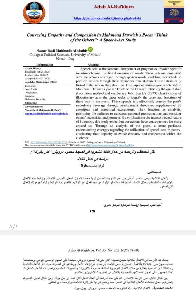 In line with the Sustainable Development Goals, Goal Four: Quality Education; Adab Al-Rafidain journal published the research paper of the faculty member of the International Relations Department at the College of Political Science, University of Mosul, Nawar Basil Mahfouz, entitled: “Conveying Empathy and Compassion through Poetic Language in Mahmoud Darwish’s Poem ‘Think of Others’: A Speech Act Study”, in September 2025.