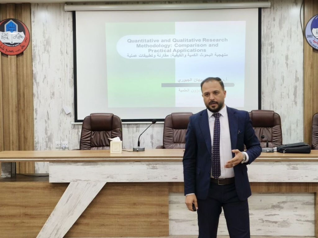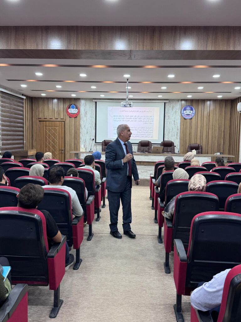 Meanwhile, on Sunday, 2 November 2025, the Assistant Dean for Scientific Affairs, Assistant Professor Dr. Khairallah Sabhan Al-Jubouri, delivered his workshop titled “Quantitative and Qualitative Research Methodology: Comparison and Qualitative Applications.”