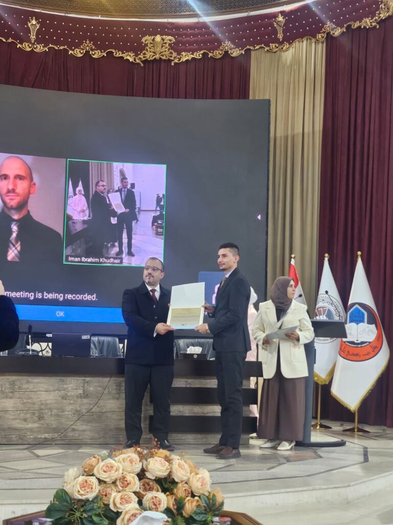 A number of faculty members and students from the College of Political Science are participating in the online academic cooperation program with Lindenwood University in the United States, and attending the recognition ceremony held by the Presidency of the University of Mosul. The College Dean extends congratulations