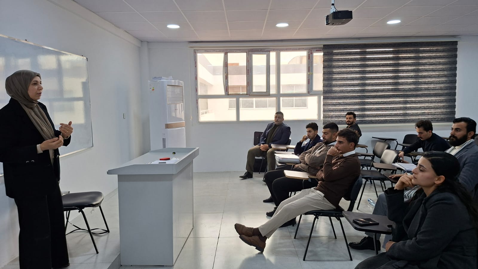 On that day, the lecture entitled “The Role of the Social Researcher in Creating a Conducive Environment During Mid-Year Examinations in Addressing Exam Anxiety and the Fears Experienced by Students Due to the Difficulty of Courses and Curricula” was delivered by Assistant Lecturer Aseel Ghanem Abd, a faculty member of the Public Policy Department.