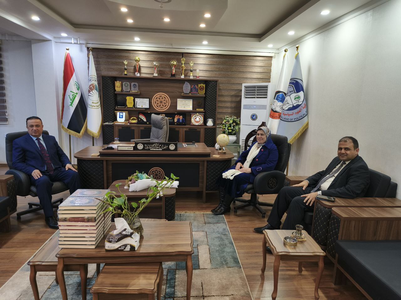 In line with the Sustainable Development Goals—Goal 4: Quality Education, and Goal 16: Peace, Justice, and Strong Institutions—and in cooperation with the Department of Studies and Planning/ Sustainable Development Unit at the Presidency of the University of Mosul, the Administrative Assistant of the University, Assistant Professor Dr. Rafal Hassan Hamed, conducted an inspection visit to the College of Political Science on the evening of Tuesday, 23 December 2025. She was received by the Dean of the College, Assistant Professor Dr. Sohaib Khalid Jasim Al-Ta’i, the Administrative Assistant Dean, Assistant Professor Dr. Ali Hussein Yassin, in addition to a number of heads of divisions and units.