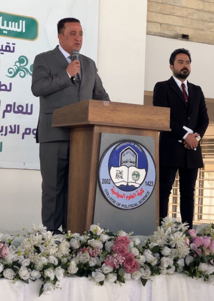 In line with the Sustainable Development Goals, Goal Four: Quality Education, and Goal Sixteen: Peace, Justice, and Strong Institutions, and in cooperation with the Department of Studies and Planning/ Sustainable Development Unit (at the Presidency of the University of Mosul); under the patronage of the President of the University, Professor Dr. Waheed Mahmoud Al-Ibrahimi, and under the supervision and attendance of the Dean of the College of Political Science, Assistant Professor Dr. Suhaib Khalid Jasim Al-Ta’i, and under the slogan “Politics is a responsibility, not a privilege,” the Media and Government Communication Division organized a special welcoming ceremony for first-year students of the morning and evening studies for the academic year 2025–2026, on Wednesday, 24 December 2025.