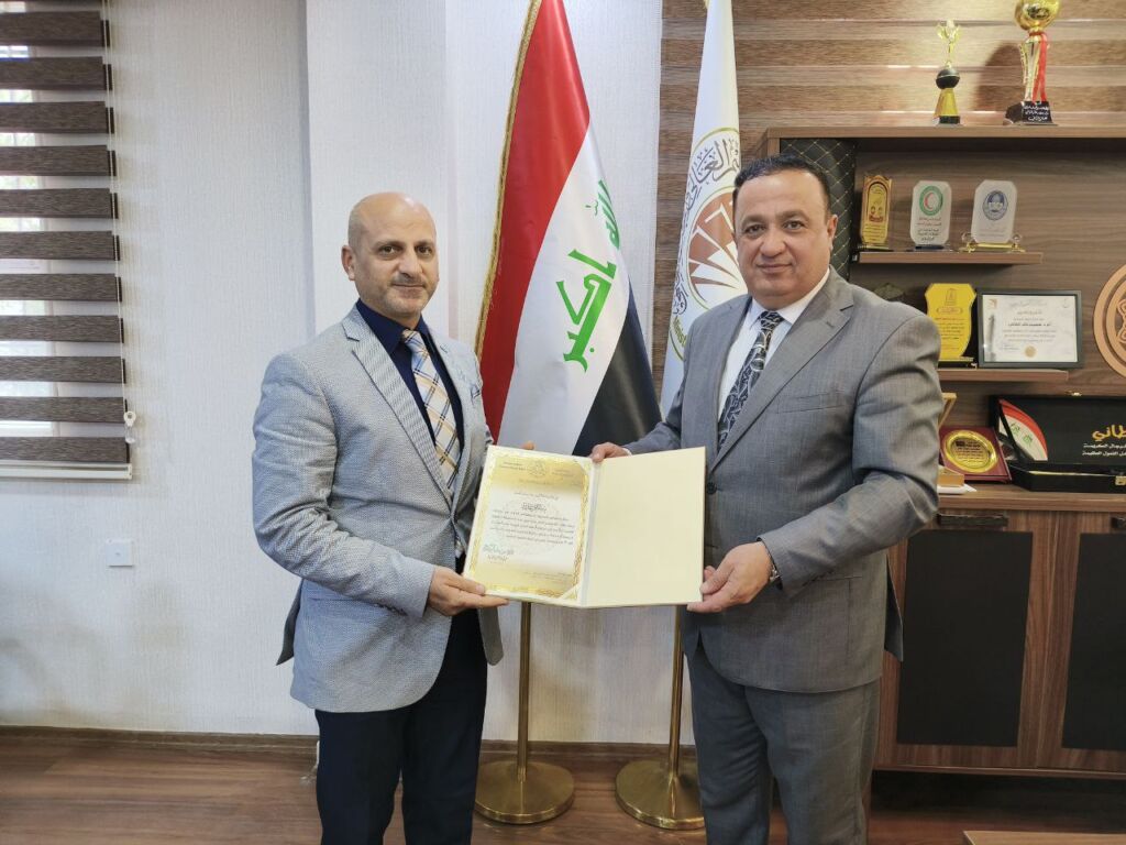 The letter of appreciation was extended in recognition of his membership on the committee for the defense of the Master’s thesis of the student Anmar Hatem Al-Bajary. The Dean of the College, Assistant Professor Dr. Suhaib Khalid Jassim Al-Ta’i, personally presented the letter of thanks, expressing his gratitude on behalf of the College, and wishing both colleges and both universities continued success and prosperity, God willing.