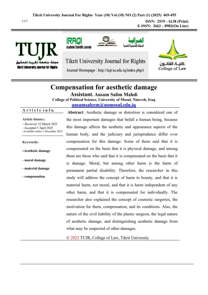Publication of a Scientific Research by a Faculty Member of the College of Political Science, University of Mosul on Compensation for Aesthetic Damage