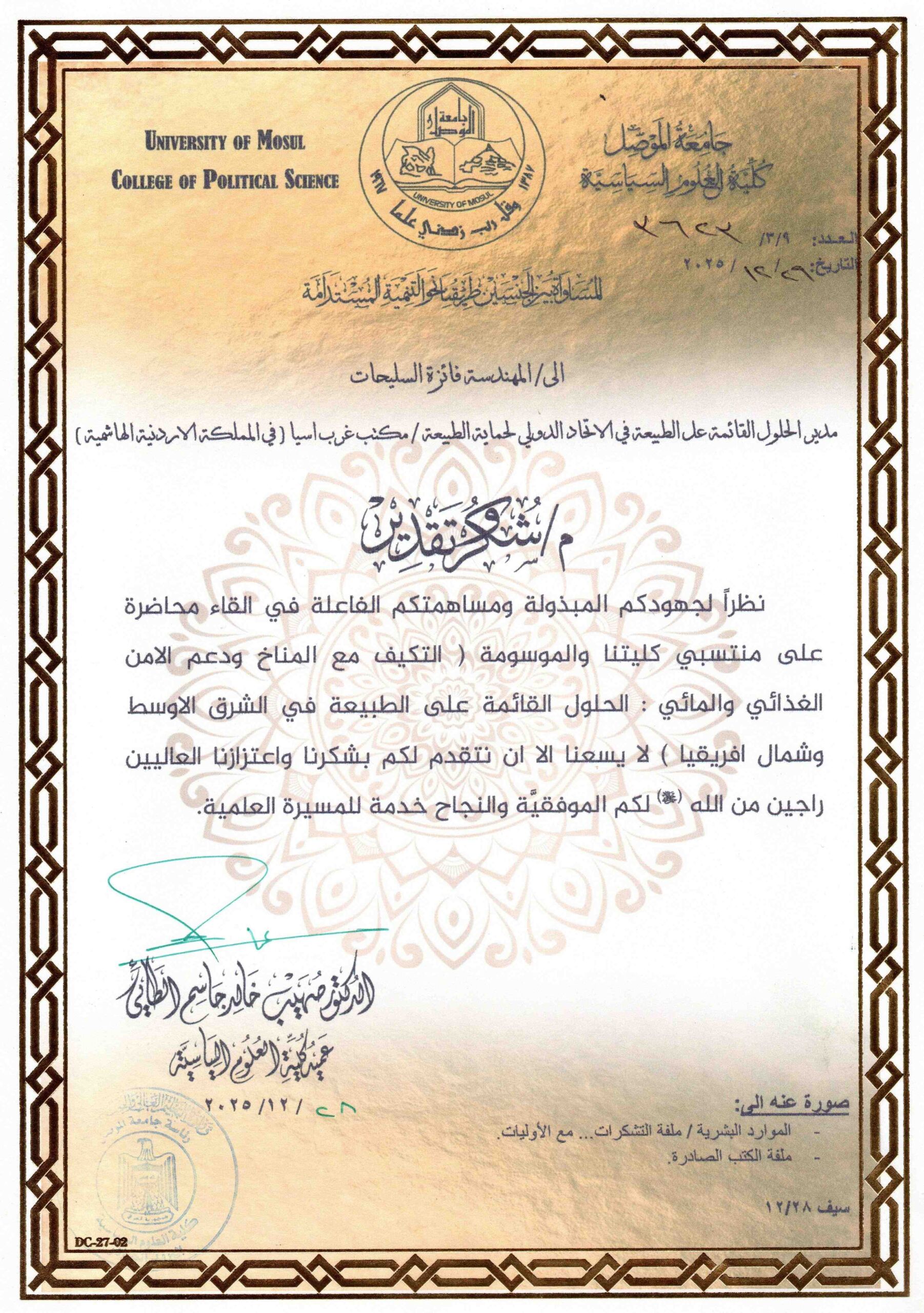 In line with the Sustainable Development Goals — Goal 2: Zero Hunger, Goal 6: Clean Water and Sanitation, and Goal 13: Climate Action — and in cooperation with the Department of Studies and Planning / Sustainable Development Unit (at the Presidency of the University of Mosul), the Deanery of the College of Political Science issued a letter of thanks and appreciation to the Director of Nature-Based Solutions for the West Asia Office, Jordanian Engineer Faiza Al-Salihat, on 29 December 2025.