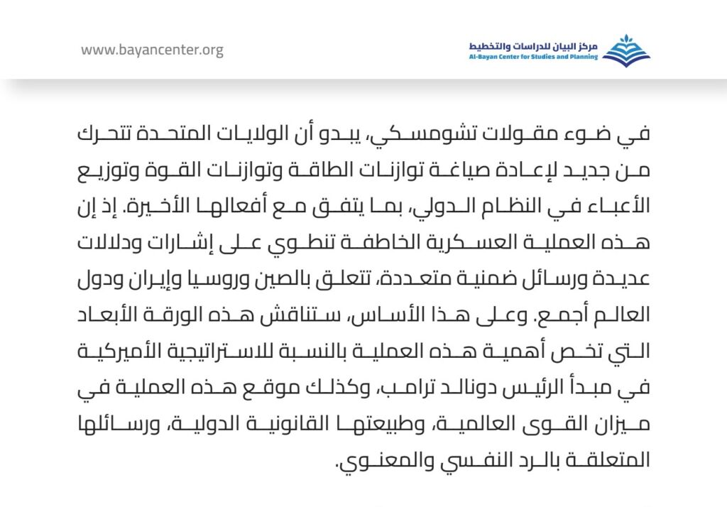 The paper concluded that the operation represents a clear shift toward reviving U.S. military dominance and marginalizing international legitimacy, reflecting the employment of force and psychological symbolism as tools of global deterrence. This trend warns of the weakening of international law and opens the door to a more chaotic international order governed by power balances rather than legal rules.