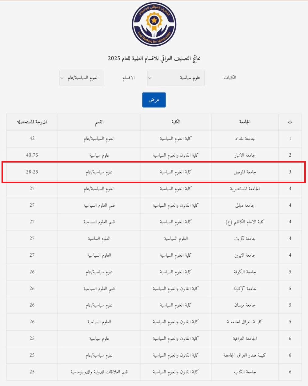 In a new academic achievement added to its scholarly record, the College of Political Science at the University of Mosul has secured third place independently in the Iraqi University Rankings for the specialization of Political Science for the year 2025. This comes after the college had shared this rank with five public universities in the same specialization in 2024, thereby reaffirming its pioneering status and academic distinction among Iraqi universities.