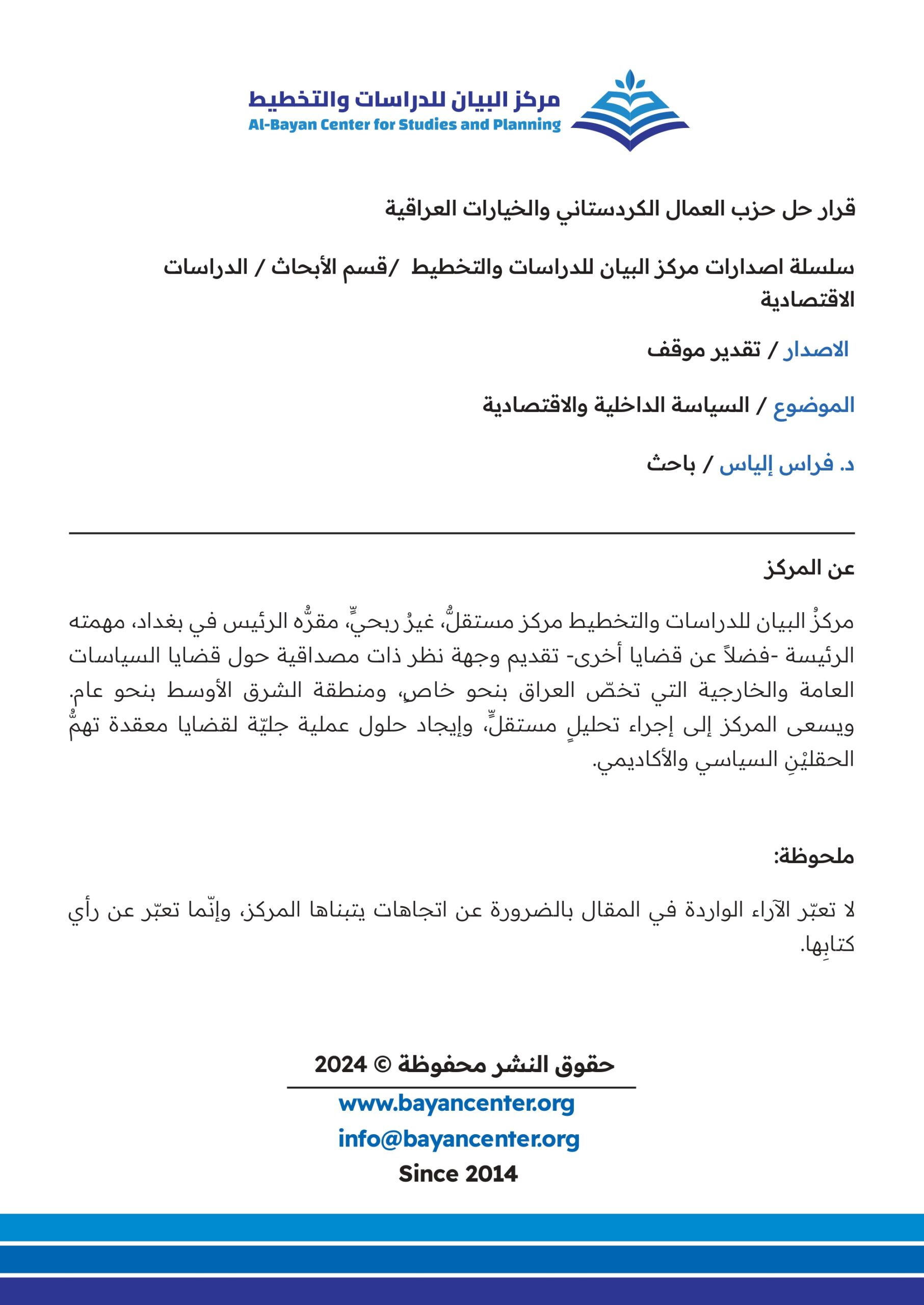 The Bayan Center for Studies and Planning Publishes a Policy Assessment Paper by a Faculty Member of the College of Political Science at the University of Mosul, Dr. Firas Mohammed Ahmed, on the Dissolution of the PKK and the Iraqi Options