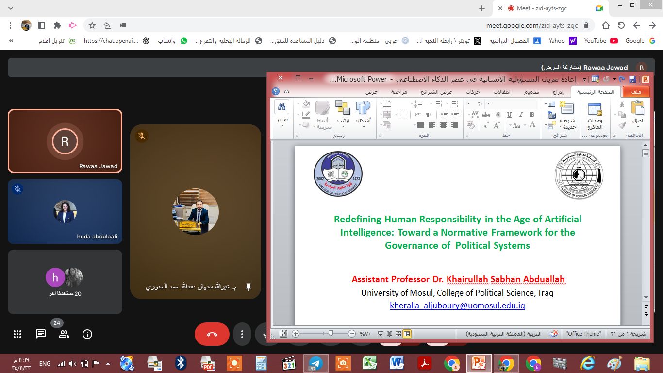A Virtual Participation by the Assistant Dean for Scientific Affairs at the College of Political Science, University of Mosul, in an International Conference Held by Ferdowsi University of Iran on “Artificial Intelligence Between Innovation and Responsibility,” and the Dean’s Office Extends Its Congratulations