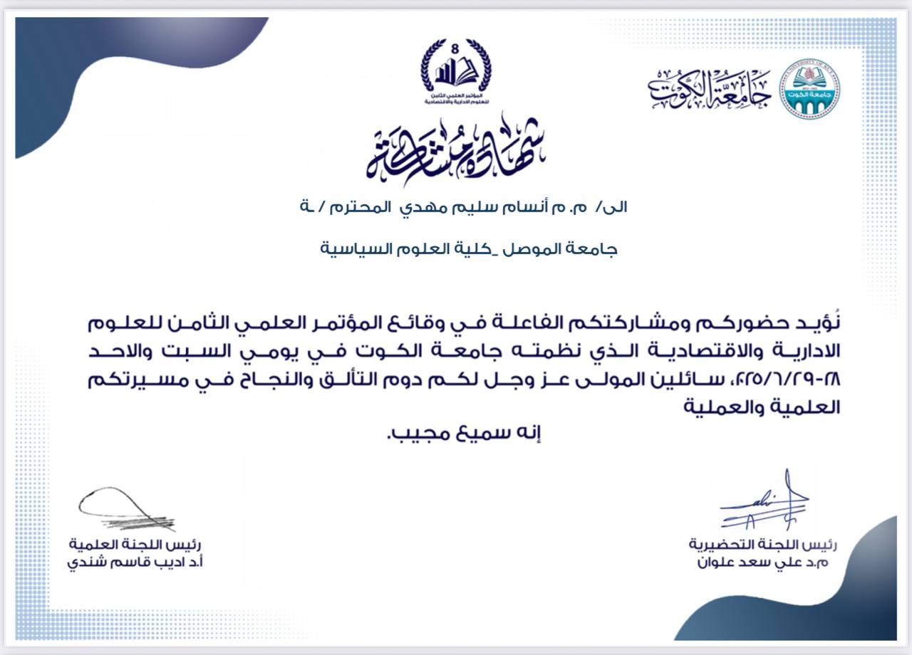 Participation of a Faculty Member from the College of Political Science, University of Mosul, in the Eighth Scientific Conference on Administrative and Economic Sciences Held by the University of Kut, with a Research Paper on the Effectiveness of Artificial Intelligence in Combating Terrorism