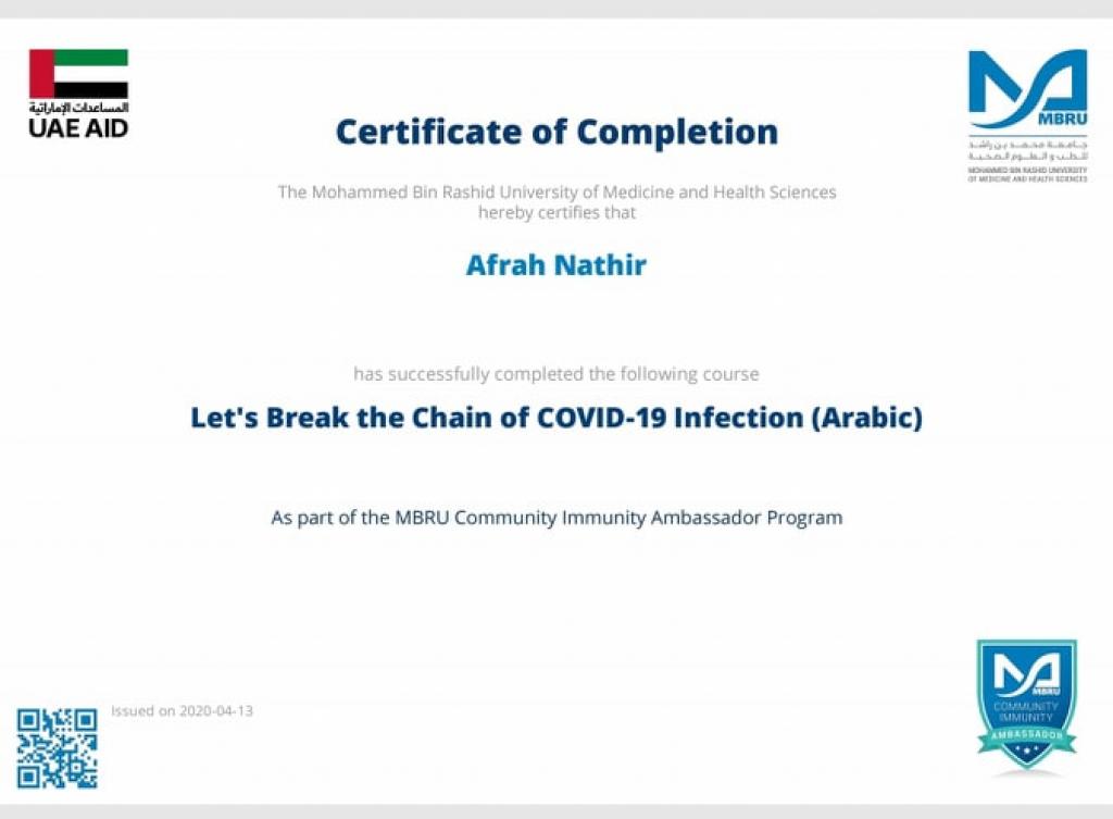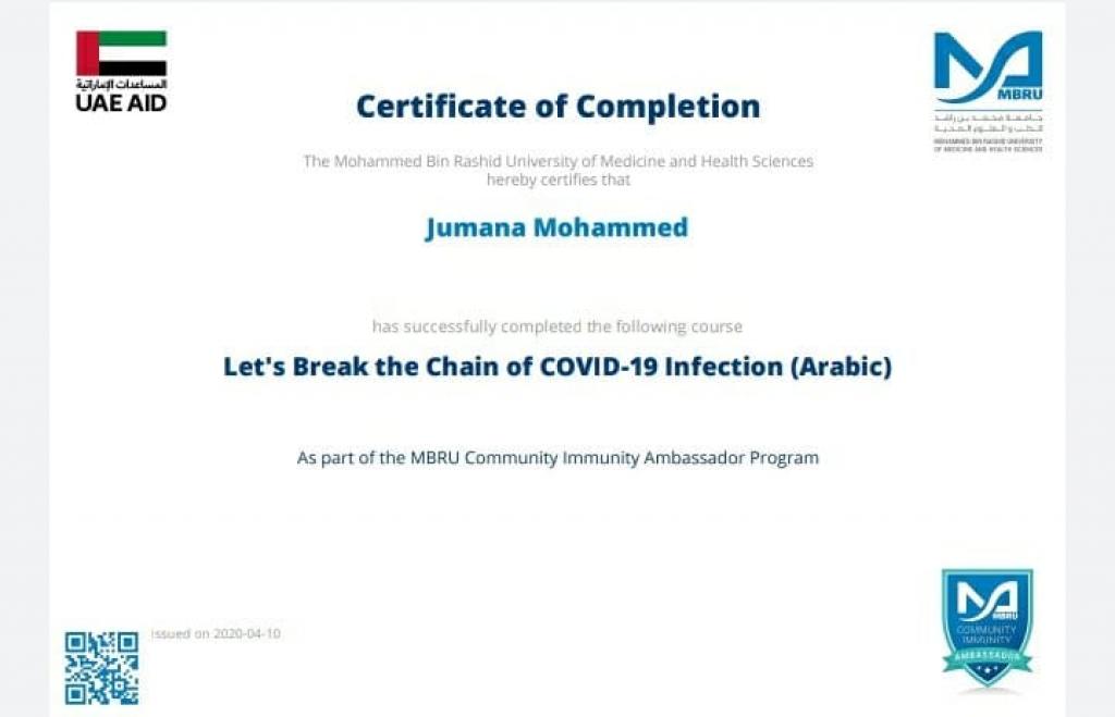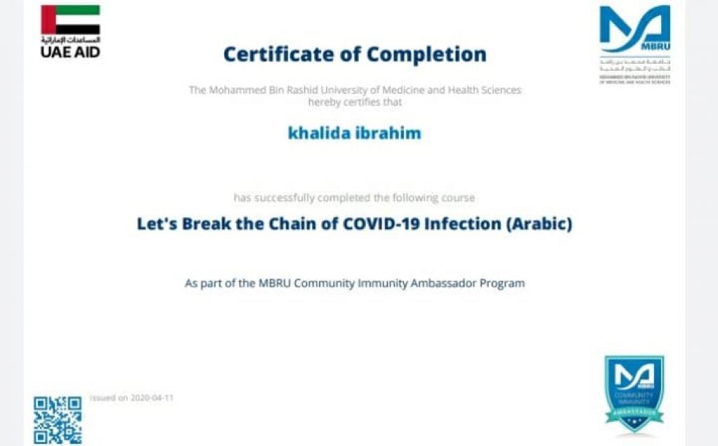 Dr. Bashar Fathy Jasim Al-Egeidy, Dr. Jumana Mohammad Nayif Al-Dulaimy, Dr. Khalida Ibrahim Khalil Al-Habeity and, Dr. Afrah Nathir Jasim Al-Azzawy, the lecturers and researchers at Regional Studies Center – University of Mosul have earned the certificates of awareness ambassadors through their participation in the training workshop held by the Mohammad bin Rashid University in the United Arab Emirates, whose program provides a rapid training on key aspects of infection and immunity to empower the community-based advocacy on how to prevent and control the spread of COVID-19.