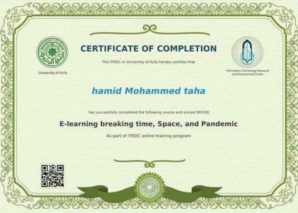The lecturers and researchers (Dr. Hamid Mohammad Taha Al-Suwaidany, Dr. Jumana Mohammad Nayif Al-Dulaimy, and Dr. Afrah Nathir Jasim Al-Azzawy), as well as the (Employee: Aws Saad Wadallah); who are at Regional Studies Center – University of Mosul have electronically received the certificates of the e-learning ambassador from the Information Research and Rehabilitation Center at the University of Kufa after passing the electronic test, which is an online training course entitled (E-learning breaking time, space and pandemic) that included a set of various test questions answered by the individual and the answer rate in it is (100) degrees.