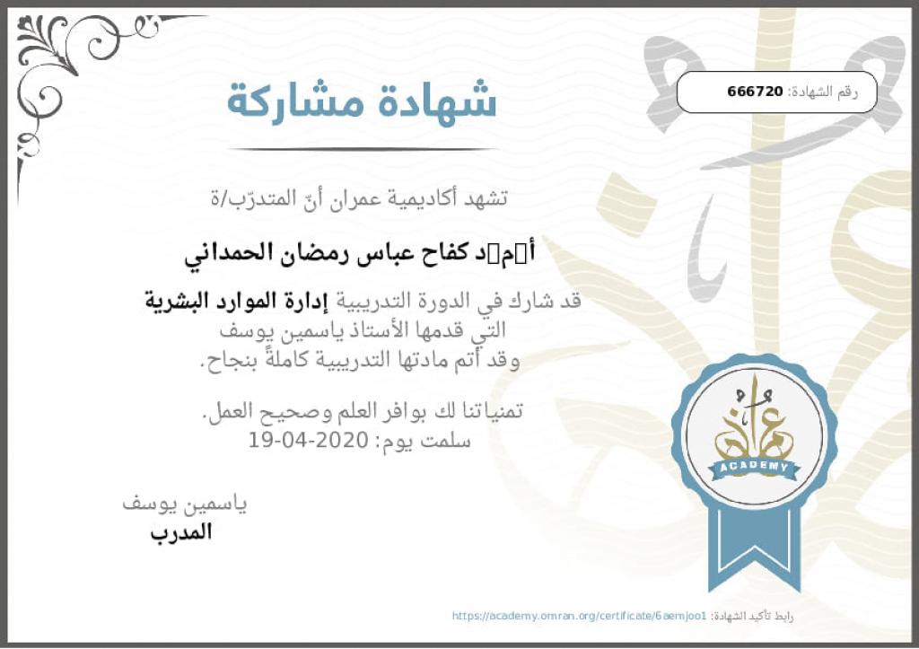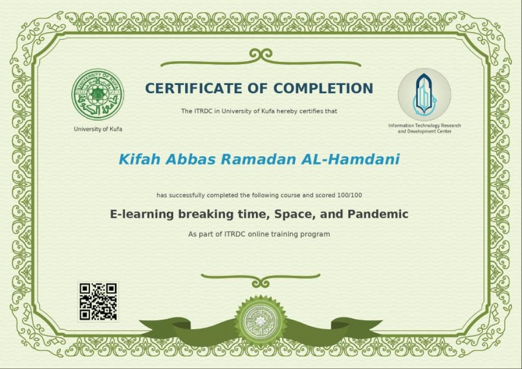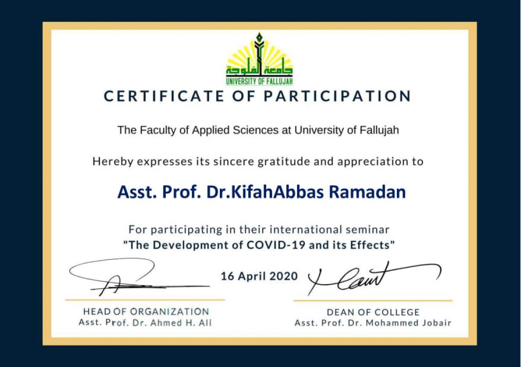 Dr. “Kifah Abbas Ramadan Al-Hamdany” , the lecturer and researcher in the Department of Historical and Cultural Studies at Regional Studies Center – University of Mosul, has taken part in some electronic training workshops: the first one was held by the International Commission for Human Development Scientists (ICSHD), under the slogan (the courage of giving and social responsibility), the workshop is titled (Narcissistic Personality), which took place on April 15/2020. The second one is in the international electronic scientific workshop called (the developments of COVID-19 and its effects), which was held by the University of Fallujah, on April 16/2020. The third workshop named received the certificates of the e-learning ambassador from the Information Research and Rehabilitation Center at the University of Kufa after passing the electronic test, which is an online training course entitled (E-learning breaking time, space and pandemic), on April 17, 2020. Finally, a workshop described (Human Resource Management), from ” Omran Training Academy”, which is an online platform that provides reliable and valuable training content on project creation, management, marketing, and financing ways, on April 19, 2020.