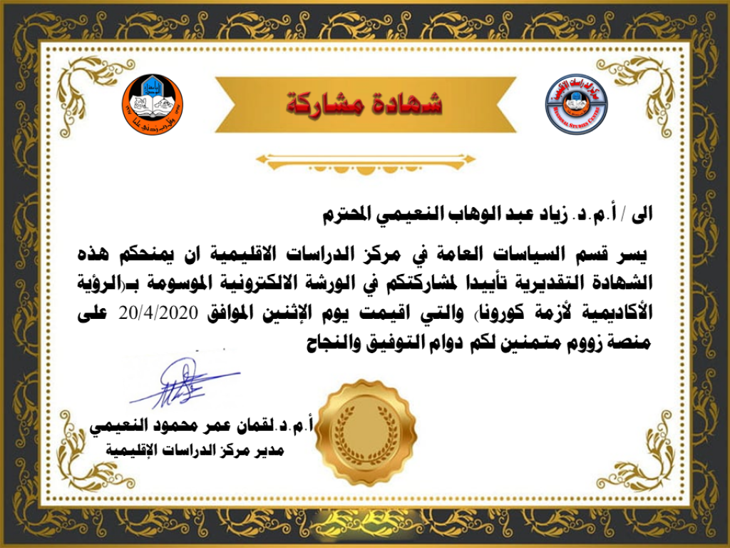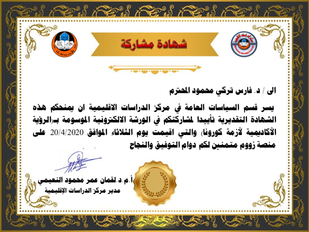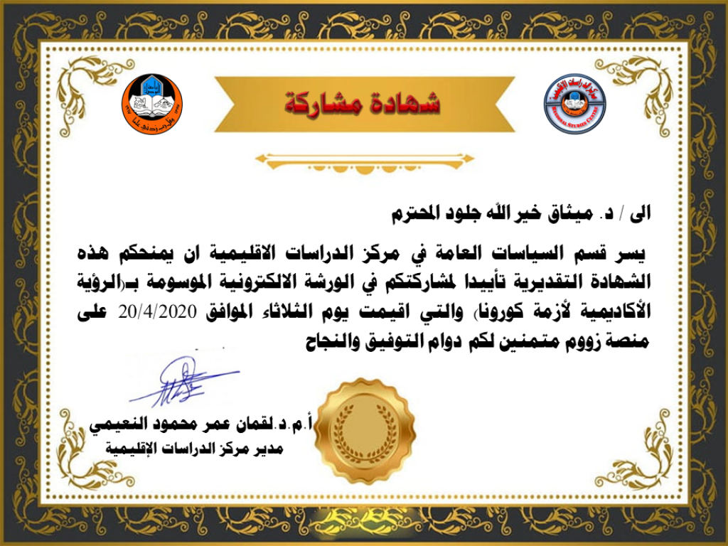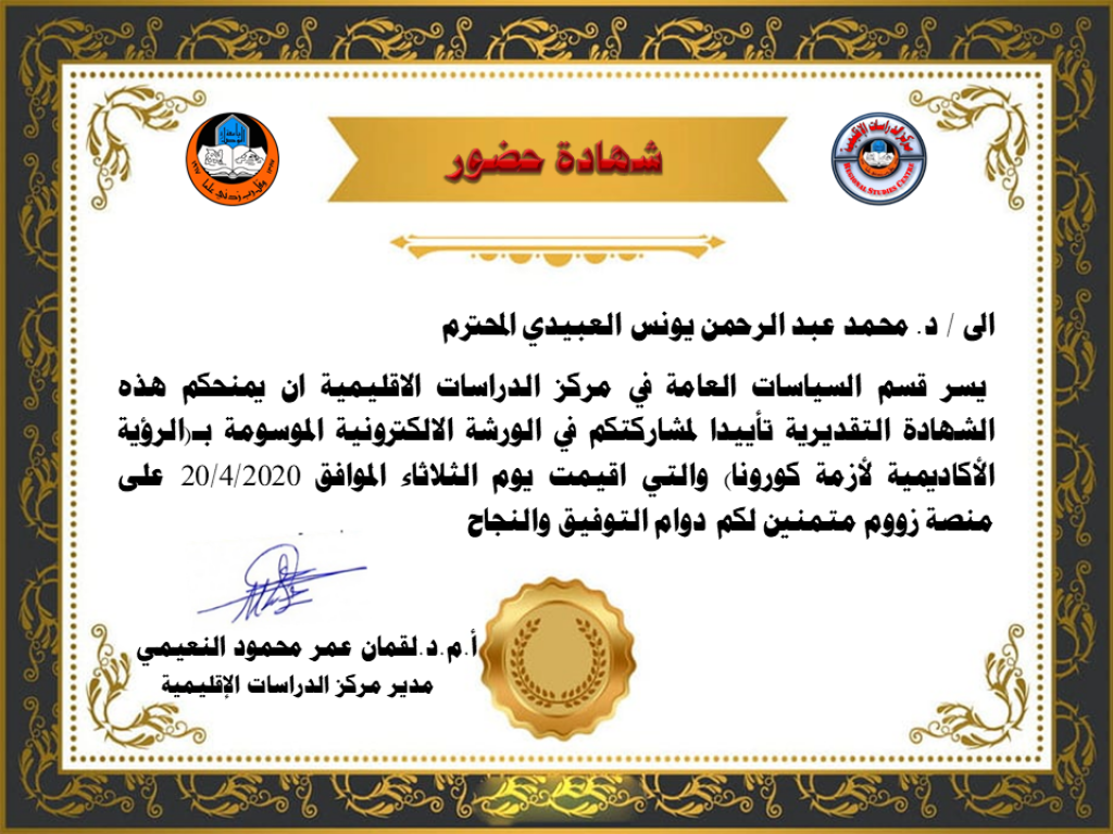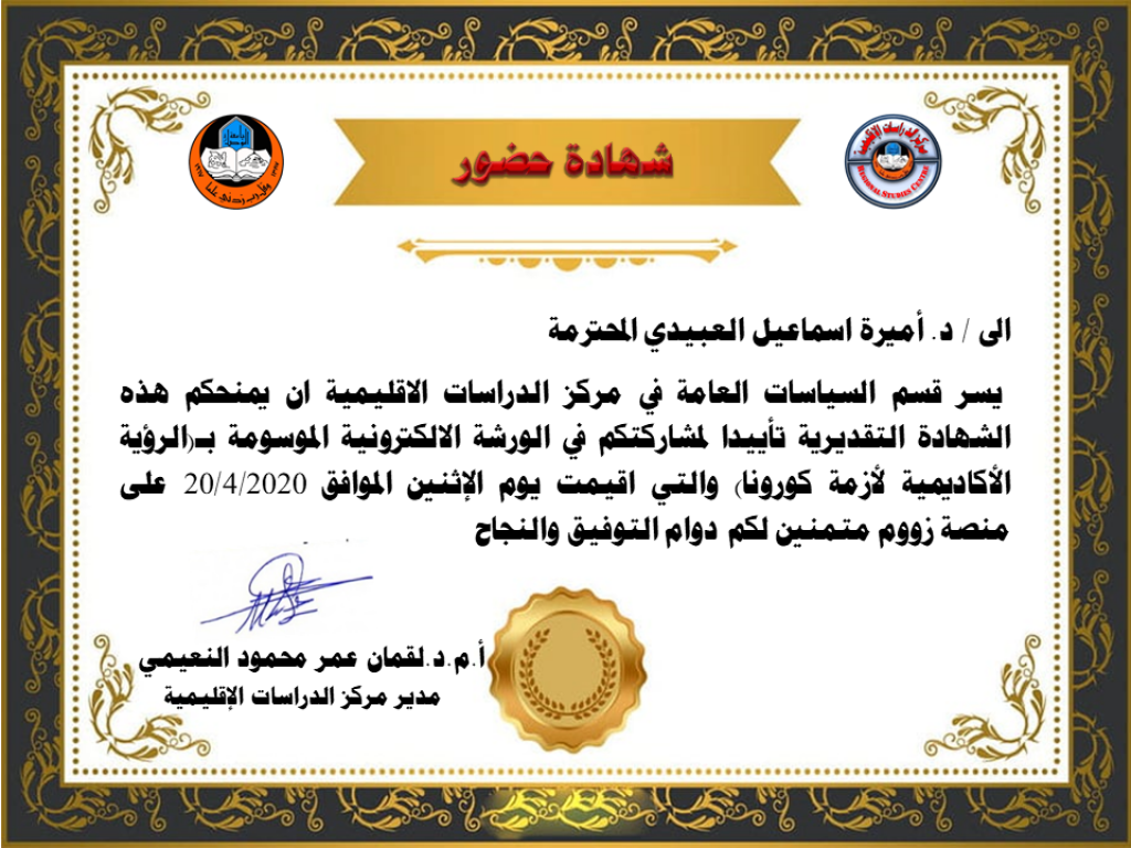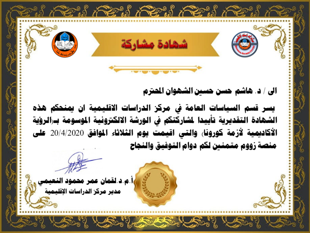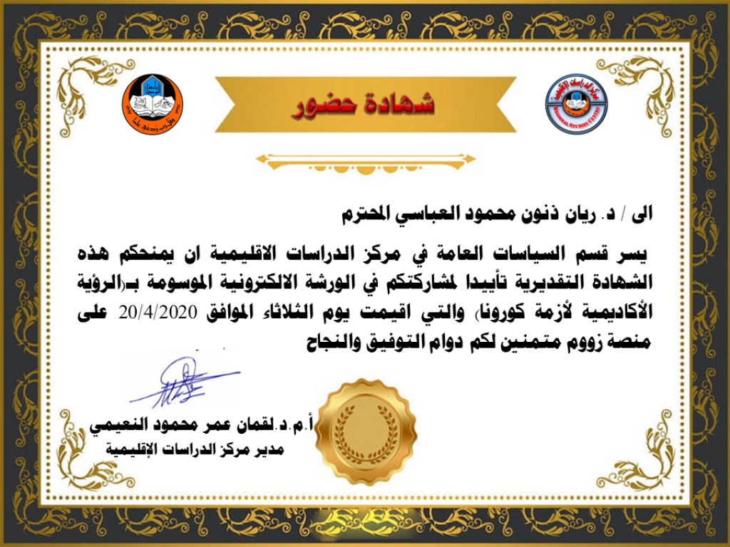 The workshop was attended by several lecturers from outside the Center ; (Dr. Fawaz Mwafaq Thanoon Al-Jalily, Dr. Mohammad Hamza Hussein Al-Dulaimy, and Mrs. Warqqa Mohammad) and others. The workshop came out with some conclusions and recommendations that will be published with the participating working papers in (Regional Views) released by the Center in a special issue on the Corona crisis and its various consequences. At the end of the workshop, certificates of appreciation were distributed to the participants: