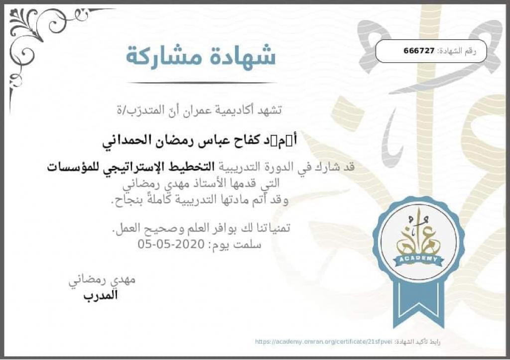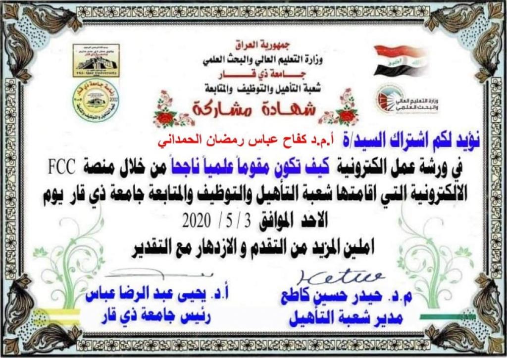 Dr. Kifah Abbas Ramadan Al-Hamdani, a lecturer and researcher at the Department of Historical and Cultural Studies at Regional Studies Center – University of Mosul has taken part in several online training workshops: namely, participation in the scientific symposium by Wasit University / College of Administration and Economics – Department of Economics, on May 9, 2020, named (The future of the global economy in light of the Coronavirus pandemic with a special reference to Iraq, solutions, and treatments), which discussed the worsening economic conditions at the global level in general and in Iraq in particular, as well as the proposed solutions and treatments for those difficulties. Moreover, participating in two workshops entitled (Strategic Planning for Institutions) and (Fundamentals and Principles of Human Resources Management) which were established by ” Omran” Training Academy on May 5, 2020, the aim of them is to develop educated elites by focusing on the issue of coming out with a group of projects to overcome crises and investing better abilities; a group of writers, bloggers, and experts contribute to this. Also, participation in a workshop (How to publish research in international journals within the Scopes container), which was held by the Department of Rehabilitation, Employment and Follow-up at Dhi Qar University on May 4, 2020, which aims to explain how to examine the scientific journal before publishing research in it ?? , after the proliferation of fake “open access” journals around the world that steal research. Finally, participation in a workshop entitled (How to be a successful scientific assessor), which was organized by Dhi Qar University / Rehabilitation, Employment, and Follow-up Department, on May 3, 2020.