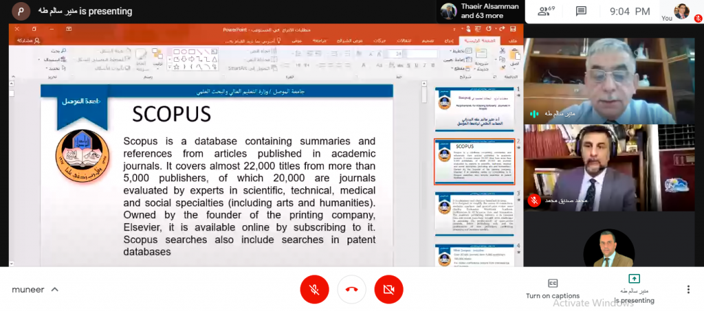 Under the kind patronage, guidance and direct support of Prof. Dr. Qusay Kamal Al-Din Al-Ahmadi, the President of Mosul University; within the framework of the University of Mosul’s keenness to develop its scientific journals and to complete the necessary steps to enter the Scope’s container, Prof. Dr. Muneer Salem Taha Al-Badrani ” Assistant President for Scientific Affairs ” held a cyber-workshop entitled ((The scientific requirements for the University of Mosul’s journals for inclusion in Scopus)) on Saturday, 30 May 2020 via “Meet” program, in the presence of some deans of colleges, directors, and managers of editing scientific journals at the University of Mosul. In this context, the editor-in-chief of Regional Studies Journal, Head of Regional Studies Center, Assist. Prof. Dr. Luqman Omar Mahmood Al-Nuaimi, and the managing editor of the journal, Assist. Prof. Dr. Mohammad Abdul-Rahman al-Obeidi, have attended the workshop. All of the attendees thanked ” Al-Badrani “for his valuable and very thoughtful lecture. In this regard, a Regional Studies Journal was evaluated in terms of its fulfillment of the requirements of inclusion Scope’s container, and it was found that it has met more than 90% of these prerequisites and only a few simple steps remained to be performed as soon as possible.