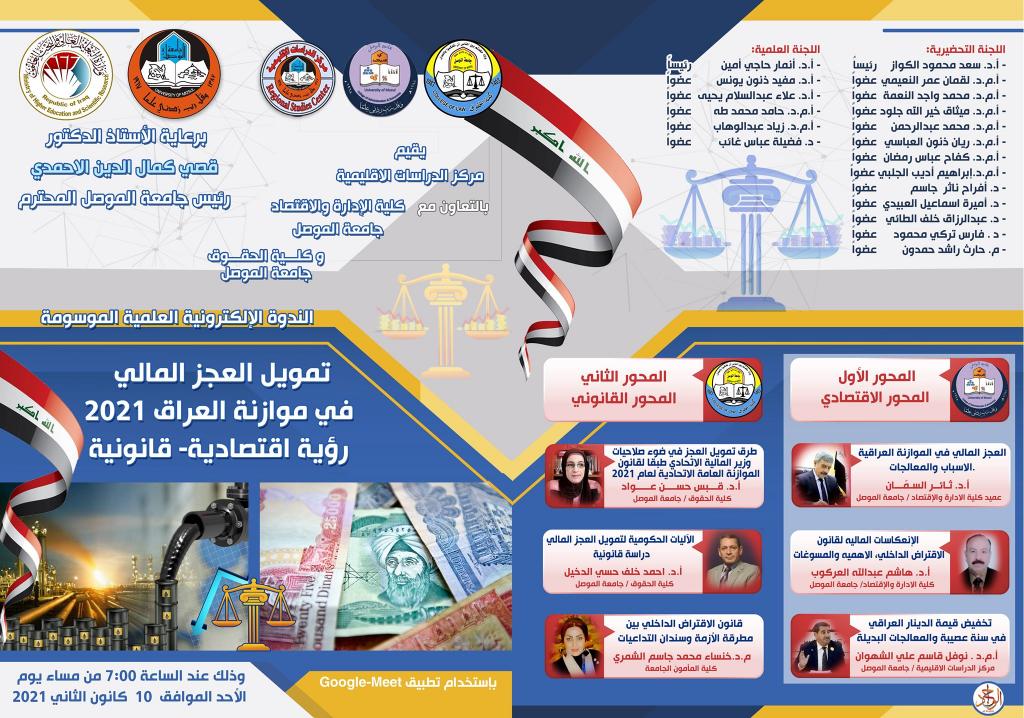 Under the patronage of Prof. Dr. Qusay Kamal Al-Din Al-Ahmadi, President of the University of Mosul, and the participation of Prof. Dr. Thaer Ahmad Saadoon Al-Samman, the Dean of the Faculty of Administration and Economics, and Assist. Prof. Dr. Wissam Nemat Al-Saadi, the Dean of the Faculty of Law at the University of Mosul,Regional Studies Center held a joint scientific symposium entitled “Financing fiscal deficit in Iraq’s budget 2021: an economic law vision”. The symposium covered the financial problems facing the Iraqi government, mechanisms, and ways to achieve societal financial balances, in light of inflation and economic stagnation as a result of the reduction of the Iraqi dinar exchange rate against the US dollar, in addition to the means of financing the deficit and the proposals recommended by the symposium to be adopted by the state and taking them to rectify a crisis that could harm the poor class of society, which represents (34%), so that the percentage of those affected by the effects of inflation may be about (62%) of the population.The symposium stressed the urgent necessity not to impose income taxes on employees, or any deductions from their salaries, to avoid a big gap in which they fall along with the effects of monetary inflation that reduced the purchasing power of cash incomes, and making real incomes drop by more than (23%) because of the inflation resulting from the reduction of the value of the Iraqi dinar, which is an immediate treatment that leads to subsequent reductions, in addition to the insufficient abundance achieved from the devaluation of the dinar in tackling the deficit in the proposed budget 2021.Participants in the symposium agreed through the submitted papers on the necessity of treating the deficit by financial means and focusing on reducing current public and investment expenditures, instead of relying on the exchange rate, as reducing expenditures does not relate to salaries, but rather with other extravagant enrichment items, beside austerity with the expenditures of the state and the three presidencies. The deliberations focused on the proposal to delete investment expenditures from the 2021 budget as exceptional due to the coronavirus pandemic.In conclusion, the symposium presented a set of proposals, perhaps the most prominent of which were the aforementioned, as well as other important points via the link: https://drive.google.com/file/d/1dYbs7XaJMJv0HW3MsQ0x-U7How9BVle0/view?usp=sharing