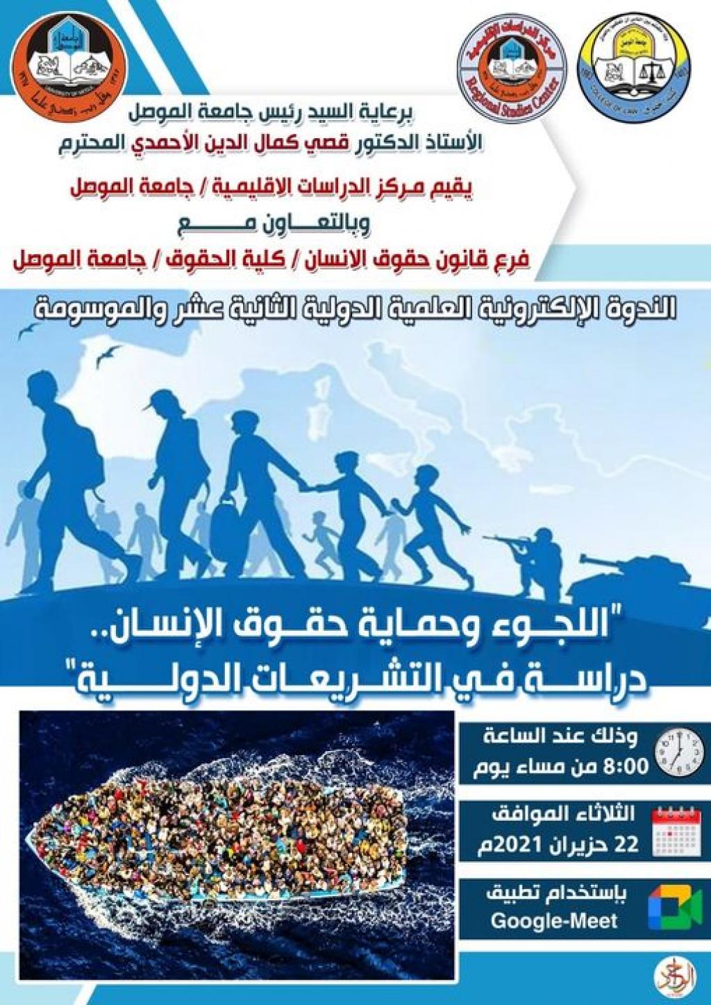 Under the patronage of the President of the University of Mosul, Prof. Dr. Qusay Kamal Al-Din Al-Ahmadi, and on the occasion of the International Day of Asylum, the Public Policies Department at Regional Studies Center, in cooperation with the Human Rights Branch at the College of Law at the University of Mosul, held the 12th International Electronic Scientific Symposium entitled (Asylum and Human Rights Protection: A Study in international legislation) with the participation of professors and researchers from inside and outside Iraq on Tuesday, June 22, 2021.The symposium aimed to discuss the topic of “the right to asylum”, which is refugees stipulated in many international and regional conventions for the protection of human rights. It is a means of protection provided by the state in the face of the reluctance of other states for people who were forced to leave their countries for reasons related to human rights violations, such as torture, persecution, armed conflict, crisis, and violence; perhaps targeted because of what they do or believe in such as ethnicity, religion or political opinions in search of a better and safer life to rebuild their lives in a different country. Emphasizing that the means of protection should be reviewed in cooperation between all countries and that the refugee problem should be dealt with as a humanitarian issue in the first place, away from any other considerations.The symposium began with a speech by the Dean of the Faculty of Law, followed by a speech by the Director of Regional Studies Center, and then a speech by the Head of the Human Rights Branch. Then the participating researchers presented their research papers that covered the topics of the symposium, the most important of which are: the national policy for the protection of and asylum seekers; Protection of the right of humanitarian asylum, and the imperative of combating illegal immigration; UNHCR as a mechanism for their protection; Grounds for asylum within the scope of the 1951 Convention; National protection of refugee women from immoral exploitation; The environmental refugee from the perspective of international humanitarian law; international legal regulation of refugee rights in international armed conflicts; finally there were discussions and comments by the participants.