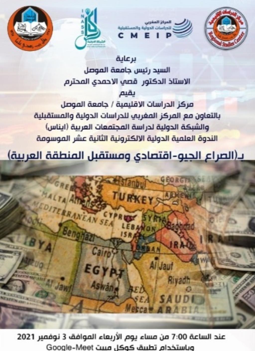 Under the patronage of Prof. Dr. Qusay Kamal Al-Din Al-Ahmadi, President of the University of Mosul, Regional Studies Center in cooperation with the Moroccan Center for International and Future Studies and the International Network for Arab Societies Study – (INASS), held the 12th International Electronic Scientific Symposium entitled (Geo-Economic Conflict and the Future of the Arab Region) on November 3, 2021.The symposium included two main central points: the first one involved the geo-economic conflict and the future of the Arab east countries. The second one dealt with the geo-economic conflict and the future of African countries.The symposium aimed at presenting the contributions of specialized local and international academic researchers and displaying their future perceptions of the Arab world in light of the escalating economic conflict, besides exploring future scenes of the conflict repercussions, in addition to searching for ways and plans to ensure the defense of the economic sovereignty of the countries of the region and engaging in global geo-economic interaction to guarantee prosperity and stability of the Arab region.