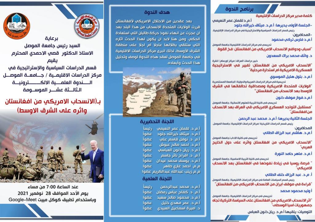 Under the patronage of Prof. Dr. Qusay Kamal Al-Din Al-Ahmadi, President of the University of Mosul, the Department of Political and Strategic Studies at Regional Studies Center held the electronic scientific symposium titled (the American withdrawal from Afghanistan and its impact on the Middle East), on November 28, 2021, with the participation of a group of professors and researchers specialized in regional and international affairs from outside and inside Iraq.The objective of the symposium is to describe and analyze the dimensions of the United States withdrawal from Afghanistan after two decades of the American occupation of this country after it was unable to end the influence of the Taliban movement that regained power. Hence, this event must have its effects that will cast a shadow sooner or later on the Middle East.The symposium included a discussion and analysis of the following topics: Reasons and motives for the American withdrawal from Afghanistan: force trap. The American withdrawal from Afghanistan: a change in the American military strategy or a phased turnover. The United States of America and the credibility of its alliances in the Middle East after the withdrawal from Afghanistan. The future of the US military presence in Iraq after the withdrawal from Afghanistan. The American withdrawal from Afghanistan and its impact on the Arab Gulf states. Russia’s opportunity to increase its influence in Afghanistan after the American withdrawal. A reading of Iran’s position on the American withdrawal from Afghanistan. The impact of the American withdrawal from Afghanistan on the Turkish policy towards the Central Asian republics.