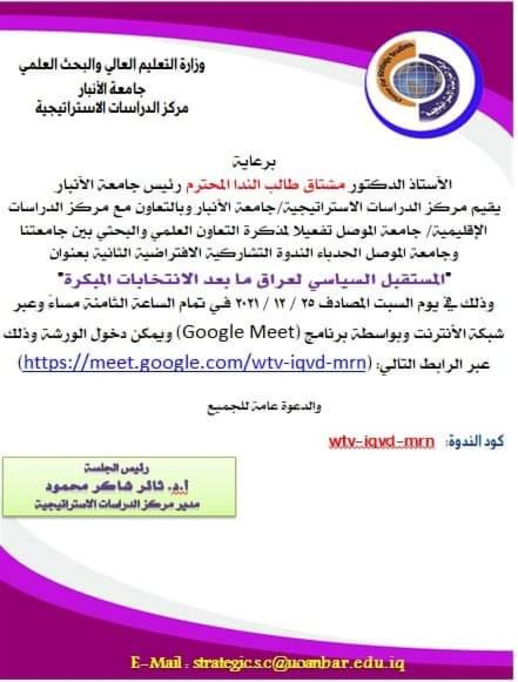 Regional Studies Center at the University of Mosul, in cooperation with the Center for Strategic Studies at the University of Anbar, held a joint virtual scientific symposium entitled “The Political Future of Iraq after the Early Elections”, on December 25, 2021, within the framework of activating the memorandum of scientific and research cooperation between the Universities of Mosul and Anbar.The symposium aimed to review many factors and variables that have emerged recently that have an impact on the political future of the Iraqi state, in the short, medium, and long term; because of the repercussions of the early election results on the internal scene in Iraq; Further, the major problems that have arisen on the international and regional arena, which will contribute to political and security instability.The symposium dealt with many strategic issues that affect the future of the Iraqi state, the administration of the Iraqi state, its foreign policy, and international relationship, including the future of the formation of the Iraqi government after the early elections, the security challenges in Iraq after the early elections, the future of Iraqi-Saudi relations, the future of the US strategy towards Iraq, and the future of Iraqi-Iranian relations in light of the results of the Iraqi parliamentary elections.