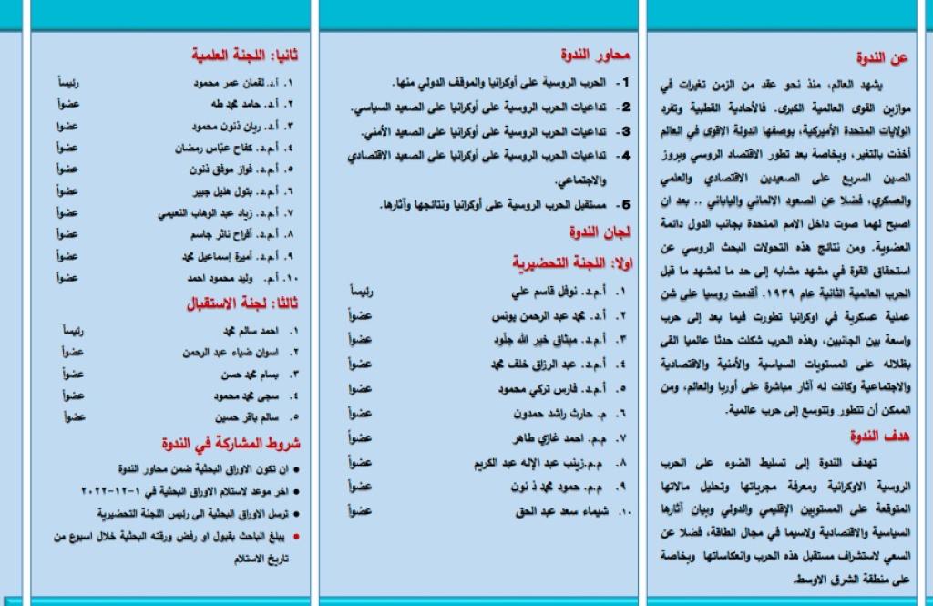 Regional Studies Center held its scientific symposium (55) on December 22, 2022, entitled “The Russian-Ukrainian War and its Regional and International Repercussions” in the presence of the President of the University of Mosul, Prof. Dr. Qusay Kamal Al-Din Al-Ahmadi.The symposium aimed at shedding light on the Russian-Ukrainian war, knowing its course, analyzing its expected results at the regional and international levels, and showing its political and economic effects, especially in the field of energy, as well as seeking to anticipate the future of this war and its reflections, especially on the Middle East region.The symposium included two sessions preceded by an opening speech.The researchers participating in the symposium covered, through their research papers, the dimensions of the aforementioned war on global affairs, as well as a review of the historical roots of the crisis. Then the symposium reviewed the international and regional positions towards the war, and finally the aftermaths of this war on European security.The symposium included a number of relevant discussions. At the end of the symposium, the recommendations of the participants were read out, followed by honoring the former directors with the Center’s shield, as an appreciation for their efforts.