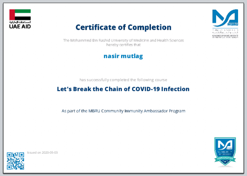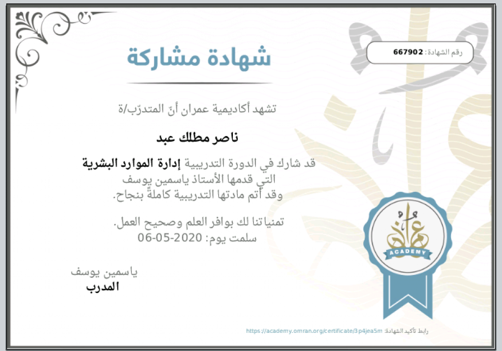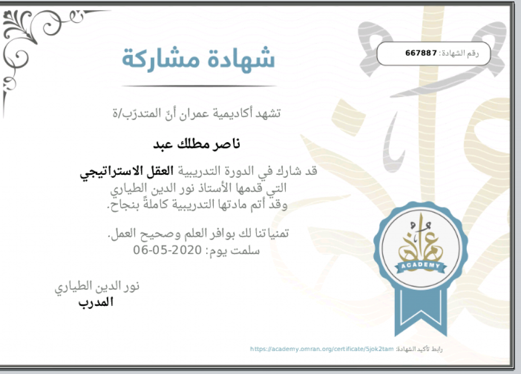 Mr. Nasir Mutlaq Abid, the translator and webmaster at Regional Studies Center – University of Mosul, has gained six certificates of appreciation through his participation in several electronic training courses, which are as follows: The first one: a certificate of the e-learning ambassador from the Center for Research and Information Qualification at the University of Kufa, entitled (E-learning breaking time, place and epidemic), on May 7, 2020; While the second certificate was from “Sadeem” platform for e-training and called (The Strategic Planning), on May 7, 2020. Then, three certificates from “Omran” Academy for e-courses, namely: (The Strategic Mind), (Basics and Principles of Human Resources Management), (Human Resources Management), on May 6, 2020. Finally, a certificate of awareness ambassadors through participation in the training workshop held by Mohammed bin Rashid University in the United Arab Emirates, on May 3, 2020.