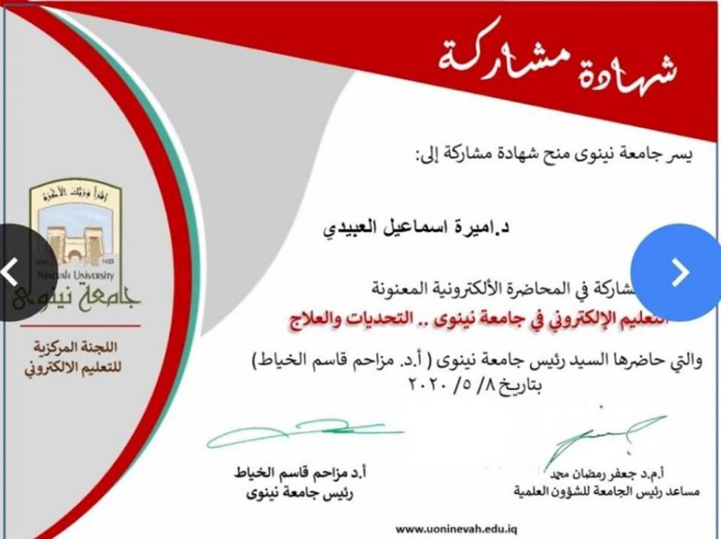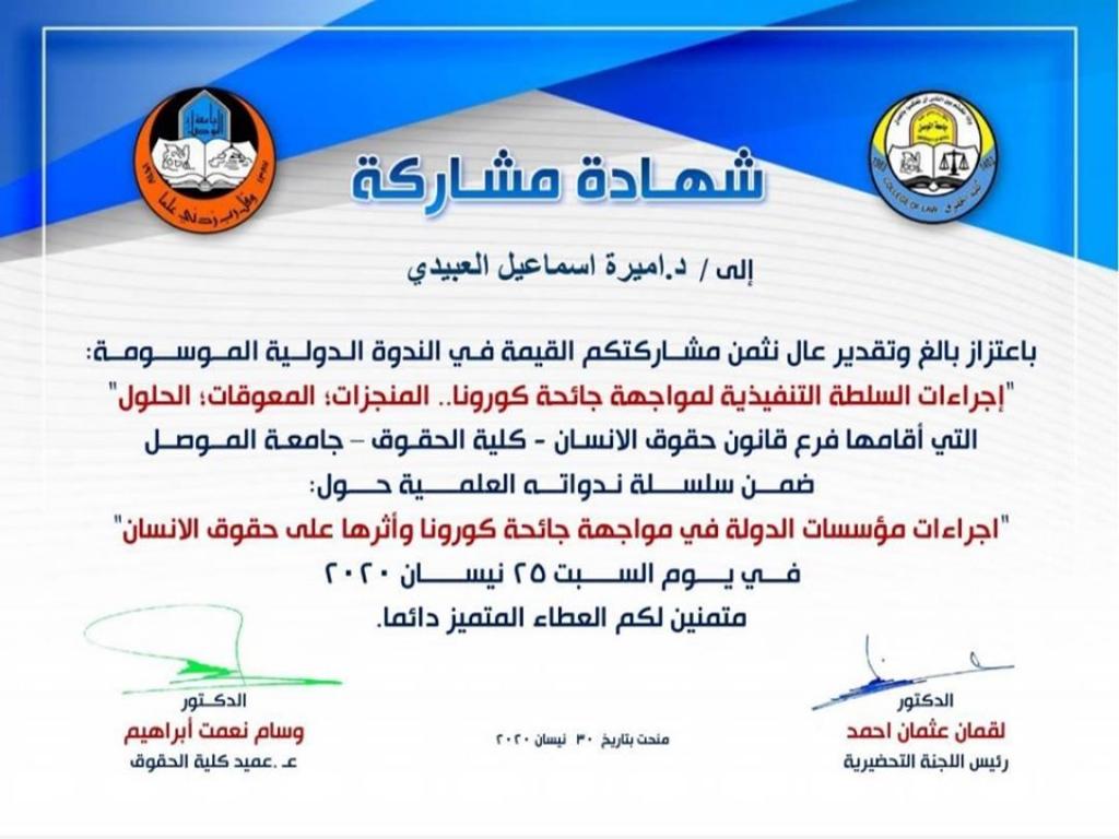 Dr. “Amira Ismail Al-Ubaidi”, a lecturer and researcher at the Department of Economic and Social Studies at Regional Studies Center – University of Mosul, has taken part in the International Scientific Forum organized by the International Academy for Leadership and Development (IALD) in cooperation with Tikrit University – College of Education for Humanities entitled (E-learning in the era of Coronavirus pandemic – Challenges and Opportunities), on May 12, 2020, it focused on the electronic training of the lecturer and the student and the obstacles in light of bad internet service. Al-Obaidi also participated in a scientific workshop by the University of Tikrit in cooperation with the Center for Continuing Education called (the basic concepts of scientific publication in Scopes and Clarivate) on May 9, 2020. The workshop aimed to identify some terms of the field of scientific publishing to facilitate the interaction with scientific journals and databases in Scopes and Clarivate. In addition to participating in an electronic lecture titled (e-learning at the University of Nineveh, challenges, and treatment), which was organized by the University of Nineveh on May 8, 2020, it revolved around the fact that the Coronavirus pandemic was sudden and rapid, so it was supposed to develop quick solutions to overcome crises in a way of teamwork. Finally, participation in the symposium that was held by the Faculty of Law at the University of Mosul under the title (the procedures of the executive authority to confront the Coronavirus pandemic .. achievements, obstacles, solutions), on April 25, 2020. The symposium dealt with health and educational aspects and the issue of social security as well as security measures taken in light of the Coronavirus pandemic, in addition to the effect of the relationship between the federal and local authorities on the course of action taken.