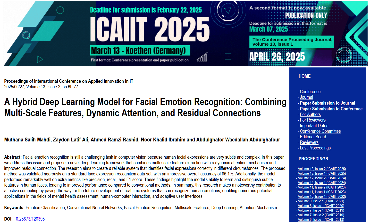 nasirmutlag2025-09-22T10:57:55+00:00A new scientific paper by Abdulgafour W. Abdulgafour, faculty member at the Regional Studies Center, has been published in Scopus. The paper, entitled “A Hybrid Deep Learning Model for Facial Emotion Recognition: Combining Multi-Scale Features, Dynamic Attention, and Residual Connections”, appeared in the Proceedings of International Conference on Applied Innovation in IT (Vol. 13, Issue 2, pp. 69–77, June 27, 2025), it is accessible via https://www.scopus.com/sourceid/21100901570. The study highlights the challenges of recognizing human facial expressions, given their subtlety and complexity. It proposes an innovative deep learning framework that integrates multi-level feature extraction, dynamic attention mechanisms, and enhanced residual connections. Experimental [Read More]