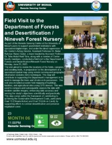 As part of the Remote Sensing Center at the University of Mosul’s plans to support government institutions with specialized digital maps, and under the direct supervision of the center’s acting director, Assistant Professor Dr. Abdul Rahman Ramzi Qaba’, a team headed by Assistant Professor Dr. Taha Abdul Hadi Taha, along with a number of center faculty members, conducted a field visit to the Department of Forests and Desertification/Nineveh Forest Nursery on Monday, June 23, 2025.