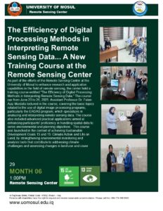 As part of the efforts of the Remote Sensing Center at the University of Mosul to enhance research and application capabilities in the field of remote sensing, the center held a training course entitled “The Efficiency of Digital Processing Methods in Interpreting Remote Sensing Data.” The course ran from June 23 to 26, 2025. Assistant Professor Dr. Faten Aziz Mustafa lectured in the course, covering the basic topics related to the use of digital image processing programs, particularly the ERDAS program, which specializes in analyzing and interpreting remote sensing data. The course also included advanced practical applications aimed at enhancing participants’ proficiency in handling spatial data to serve environmental and planning objectives. This course was launched in the context of achieving Sustainable Development Goals 13 and 15: Climate Action and Life on Land, by strengthening environmental monitoring and analysis tools that contribute to addressing climate challenges and assessing changes in land use and cover…