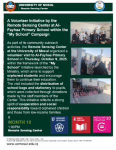 As part of its community outreach activities, the Remote Sensing Center at the University of Mosul organized a volunteer visit to Al-Fayhaa Primary School on Thursday, October 9, 2025, within the framework of the “My School” initiative launched by the Ministry, which aims to support orphaned students and encourage them to continue their education.