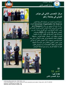 In response to an invitation from the American Organization for Science and Research, five faculty members from the Remote Sensing Center participated in the International Conference on Mental Health in the Age of Artificial Intelligence, held at Zakho University on Thursday, October 16, 2025. The participation also included involvement in the administrative and scientific committees of the conference to discuss the key scientific themes, particularly those related to applications of artificial intelligence in the contemporary era. This engagement reflects the Remote Sensing Center’s ongoing commitment to fostering scientific collaboration and openness with global research institutions across various disciplines, contributing to the enhancement of the center’s research capabilities and supporting the academic mission of the University of Mosul.